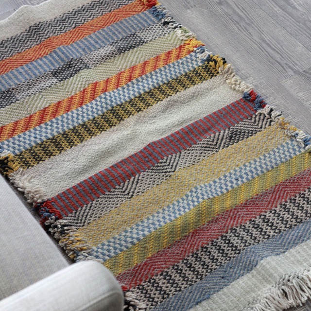 【商品説明】 『彩りを躍らす、秋祭(あきまつり)』 色とりどりの羊毛が軽やかに並び、まるで祭囃子にあわせて舞う踊りのよう。 赤は提灯の明かり、黄色は稲穂の実り、青は澄んだ秋空。 一本一本の縞模様が重なり合い、収穫の喜びと秋祭りの賑わいを映し出す一枚です。 「秋祭(あきまつり)」という言葉のとおり、心が浮き立ち、日常に楽しさを添えてくれる存在。 玄関に敷けば「おかえり」と元気に迎えてくれ、リビングでは空間の主役として明るさを放ちます。 こちらで質感や素材感を動画でチェック✔ ▶ https://www.instagram.com/p/DPROjLEk9V5/?img_index=8 ◆原産国 :モロッコ ◆年代 :現行品 ◆サイズ :約118×68cm (フリンジ込み) ◆フリンジ:(両サイド)約2.5cm/(下)約7cm ◆素材 :ウール(羊毛)100% 現地にてクリーニング済み、日本にて粘着テープでのお手入れ、陰干し済。 屋内での使用に問題ありません。 【商品について】 当店では、モロッコのアトラス山脈で暮らしているベルベル民族の女性たちによって、手紡ぎ・染色・手織りされているザナフィラグを直輸入しております。 半分遊牧民であるベルベル民族の日々の暮らしから生まれたザナフィラグ。 ≪世界の文化の交差点≫と呼ばれているモロッコだからこそ生まれた、ベルベル文化特有の象徴的な幾何学紋様が描かれた特徴的な絨毯です。 母から子へ、先祖代々受け継がれてきた手織りの技巧的な技術と、織り手さんたちの想いや願いを込めた紋様柄は、同じものはなく一期一会の出逢いです。 羊毛から染色原料に至るまで、全て自然素材、手作業での逸品となりますので、多少の歪みや色ムラ、糸の混在が見受けられる場合がございますが、手仕事ならではのラフな風合いや温もりを感じていただけますと幸いです。 【普段のお手入れ方法】 ・表と裏を粘着テープ(コロコロ)で細かい埃を取り除き、お天気の良い日中に陰干しする程度で構いません。 布団たたきなどでパンパンと叩くと寝ていた毛足が立ち上がり、より気持ちのいいラグになります。 ・シミ汚れ等が付着した場合は、中性洗剤をぬるま湯で溶かした液に布を濡らし、汚れをトントンと叩くように染み抜きを行ってください。 裏面に乾いた布を挟み込んで作業すると、より染み汚れが落としやすくなります。 ・製品の特性上、ウール特有の匂い、天然染料の匂いが残っていることがあります。 梅雨や夏はウール自体が湿気を含むことでウール本来の匂いの原因にもなりますので、お天気の良い日に陰干ししていただきできるだけ湿気を飛ばしてあげると、快適にお使いいただけます。 【その他、注意事項】 ・「新品・未使用」の現行品及び日本での検品を行っておりますが、毛羽立ち、シミなどが見られる場合がございますが良品の範囲内として販売しております。予めご了承ください。 ・できる限り実物と近い色味が出るように写真撮影しておりますが、お使いのモニターやブラウザにより違って見える場合がございます。予めご了承ください。 ・当店のラグはすべて手仕事での制作のため、記載のサイズには多少の誤差がございます。おおよその目安にしていただければと思います。