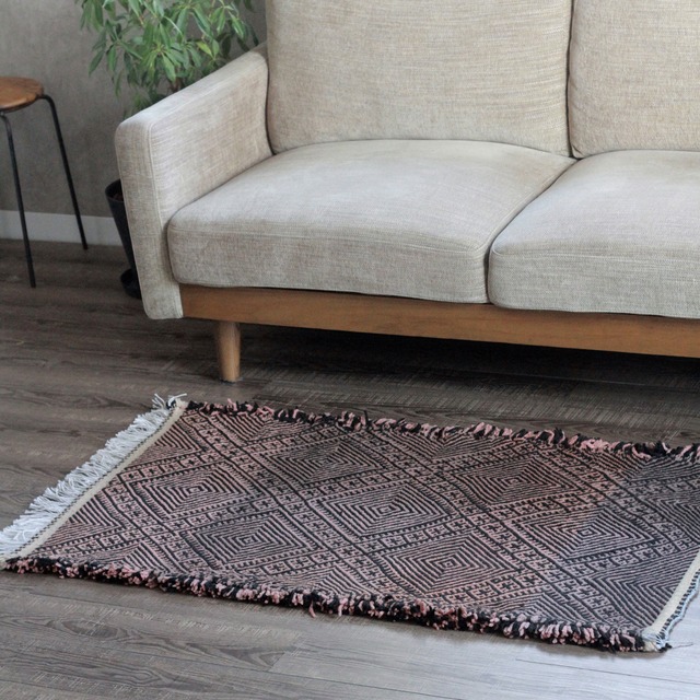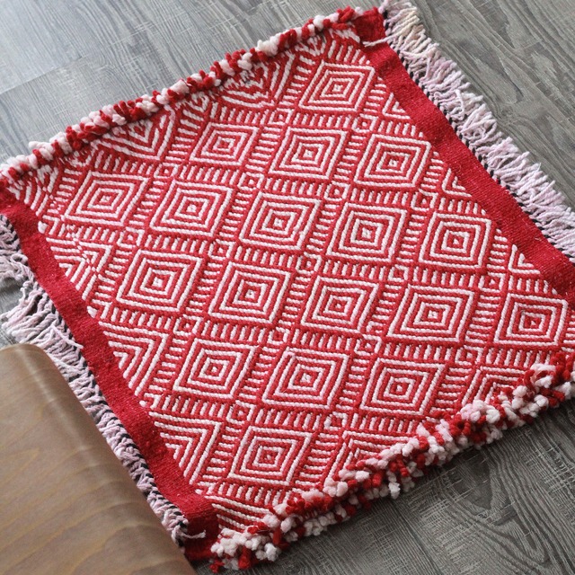 【The WORLD Market会場 先行販売商品です】 ONLINE SHOPでは、7/12(土) 21:00 - 7/13(日) 23:59販売予定です。 【商品説明】 『華を宿す、紅映(こうえい)』 視線を惹きつける、深紅の存在感。 そこに規則正しく並ぶひし形は、まるで花弁が広がるように、整いながら咲いている。 「紅映(こうえい)」は、赤の持つ情熱と、文様の秩序が織りなす、静かなる華やぎを纏ったザナフィラグです。 深く染められた紅のベースに、アイボリーで浮かび上がる幾何学模様。 そのコントラストは、空間にしっかりとしたアクセントを添えながら、どこか落ち着きのある美しさを保っています。 縁に揺れるフリンジの柔らかな動きも、その華やかさに余白を与え、やさしく包み込むよう。 存在感がありながら、決して主張しすぎない。 このザナフィラグは、暮らしの中で“芯のある華やかさ”をそっと灯します。 アイボリーやベージュのファブリックと合わせて「紅一点」の美しさを引き立てて。 ナチュラル素材の家具と組み合わせることで、凛とした和の趣にも。 ◆原産国 :モロッコ ◆年代 :現行品 ◆サイズ :約62×60cm (フリンジ込み) ◆フリンジ:(両サイド)約2.5cm/(上下)約4cm、4cm ◆素材 :ウール(羊毛)100% 現地にてクリーニング済み、日本にて粘着テープでのお手入れ、陰干し済。 屋内での使用に問題ありません。 【商品について】 当店では、モロッコのアトラス山脈で暮らしているベルベル民族の女性たちによって、手紡ぎ・染色・手織りされているザナフィラグを直輸入しております。 半分遊牧民であるベルベル民族の日々の暮らしから生まれたザナフィラグ。 ≪世界の文化の交差点≫と呼ばれているモロッコだからこそ生まれた、ベルベル文化特有の象徴的な幾何学紋様が描かれた特徴的な絨毯です。 母から子へ、先祖代々受け継がれてきた手織りの技巧的な技術と、織り手さんたちの想いや願いを込めた紋様柄は、同じものはなく一期一会の出逢いです。 羊毛から染色原料に至るまで、全て自然素材、手作業での逸品となりますので、多少の歪みや色ムラ、糸の混在が見受けられる場合がございますが、手仕事ならではのラフな風合いや温もりを感じていただけますと幸いです。 【普段のお手入れ方法】 ・表と裏を粘着テープ(コロコロ)で細かい埃を取り除き、お天気の良い日中に陰干しする程度で構いません。 布団たたきなどでパンパンと叩くと寝ていた毛足が立ち上がり、より気持ちのいいラグになります。 ・シミ汚れ等が付着した場合は、中性洗剤をぬるま湯で溶かした液に布を濡らし、汚れをトントンと叩くように染み抜きを行ってください。 裏面に乾いた布を挟み込んで作業すると、より染み汚れが落としやすくなります。 ・製品の特性上、ウール特有の匂い、天然染料の匂いが残っていることがあります。 梅雨や夏はウール自体が湿気を含むことでウール本来の匂いの原因にもなりますので、お天気の良い日に陰干ししていただきできるだけ湿気を飛ばしてあげると、快適にお使いいただけます。 【その他、注意事項】 ・「新品・未使用」の現行品及び日本での検品を行っておりますが、毛羽立ち、シミなどが見られる場合がございますが良品の範囲内として販売しております。予めご了承ください。 ・できる限り実物と近い色味が出るように写真撮影しておりますが、お使いのモニターやブラウザにより違って見える場合がございます。予めご了承ください。 ・当店のラグはすべて手仕事での制作のため、記載のサイズには多少の誤差がございます。おおよその目安にしていただければと思います。