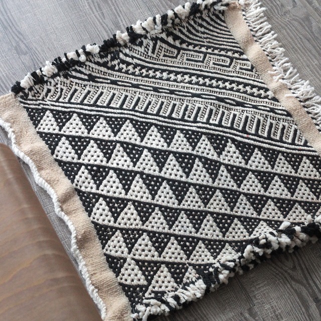 【The WORLD Market会場 先行販売商品です】 ONLINE SHOPでは、7/12(土) 21:00 - 7/13(日) 23:59販売予定です。 【商品説明】 『律を編む、玄紋(げんもん)』 織り手の手の中から、ひと目ずつ刻まれる“律”がある。 三角の列が生む規則性。 直線と曲線の交差。 繰り返す文様のなかに、確かな音が響いてくるような―― 「玄紋(げんもん)」は、その名の通り、文様のなかに“音と力”が編み込まれたようなザナフィラグです。 黒と生成りで描かれる幾何学模様は、まるで譜面のように構成され、空間に静かな律動をもたらします。 端のフチには波打つような柔らかさがあり、直線的な模様と有機的なフォルムの対比も美しい。 まっすぐな強さと、ゆるやかな余白。 その両方を静かに内包したザナフィラグです。 音楽や本のある空間、静かな書斎やリビングに。 ミッドセンチュリーの家具やモノトーンの空間と相性よく、アートピースのような存在感を放ちます。 ◆原産国 :モロッコ ◆年代 :現行品 ◆サイズ :約61×59cm (フリンジ込み) ◆フリンジ:(両サイド)約2.5cm/(下)約3cm ◆素材 :ウール(羊毛)100% 現地にてクリーニング済み、日本にて粘着テープでのお手入れ、陰干し済。 屋内での使用に問題ありません。 【商品について】 当店では、モロッコのアトラス山脈で暮らしているベルベル民族の女性たちによって、手紡ぎ・染色・手織りされているザナフィラグを直輸入しております。 半分遊牧民であるベルベル民族の日々の暮らしから生まれたザナフィラグ。 ≪世界の文化の交差点≫と呼ばれているモロッコだからこそ生まれた、ベルベル文化特有の象徴的な幾何学紋様が描かれた特徴的な絨毯です。 母から子へ、先祖代々受け継がれてきた手織りの技巧的な技術と、織り手さんたちの想いや願いを込めた紋様柄は、同じものはなく一期一会の出逢いです。 羊毛から染色原料に至るまで、全て自然素材、手作業での逸品となりますので、多少の歪みや色ムラ、糸の混在が見受けられる場合がございますが、手仕事ならではのラフな風合いや温もりを感じていただけますと幸いです。 【普段のお手入れ方法】 ・表と裏を粘着テープ(コロコロ)で細かい埃を取り除き、お天気の良い日中に陰干しする程度で構いません。 布団たたきなどでパンパンと叩くと寝ていた毛足が立ち上がり、より気持ちのいいラグになります。 ・シミ汚れ等が付着した場合は、中性洗剤をぬるま湯で溶かした液に布を濡らし、汚れをトントンと叩くように染み抜きを行ってください。 裏面に乾いた布を挟み込んで作業すると、より染み汚れが落としやすくなります。 ・製品の特性上、ウール特有の匂い、天然染料の匂いが残っていることがあります。 梅雨や夏はウール自体が湿気を含むことでウール本来の匂いの原因にもなりますので、お天気の良い日に陰干ししていただきできるだけ湿気を飛ばしてあげると、快適にお使いいただけます。 【その他、注意事項】 ・「新品・未使用」の現行品及び日本での検品を行っておりますが、毛羽立ち、シミなどが見られる場合がございますが良品の範囲内として販売しております。予めご了承ください。 ・できる限り実物と近い色味が出るように写真撮影しておりますが、お使いのモニターやブラウザにより違って見える場合がございます。予めご了承ください。 ・当店のラグはすべて手仕事での制作のため、記載のサイズには多少の誤差がございます。おおよその目安にしていただければと思います。