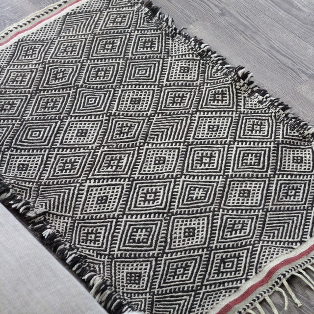 【商品説明】 『静寂を編む、墨綾(すみあや)』 墨を流した和紙のように、凛とした静けさをたたえる一枚。 幾何学模様が織りなすリズムは、遠くで響く水音のように、心にゆるやかな余白を残します。 白と黒のコントラストは潔く、それでいて柔らか。 モノトーンでありながら、繊細な綾を織り込んだ表情は、光の角度や置く場所によって、まるで呼吸するように見え方を変えていきます。 「墨綾(すみあや)」は、静かな湖面に漂う月影の綾なす姿から。 余計な装飾を排した空間にこそ映える、静謐で端正なラグです。 北欧インテリアのクリーンな佇まいや、和モダンの落ち着いた空気感とも相性抜群。 空間を“静けさで満たす”贈りものです。 こちらで質感や素材感を動画でチェック✔ ▶ https://www.instagram.com/p/DQJXpURkc3X/?img_index=9 ◆原産国 :モロッコ ◆年代 :現行品 ◆サイズ :約114×70cm (フリンジ込み) ◆フリンジ:(両サイド)約6cm/(上下)約7cm、約6cm ◆素材 :ウール(羊毛)100% 現地にてクリーニング済み、日本にて粘着テープでのお手入れ、陰干し済。 屋内での使用に問題ありません。 【商品について】 当店では、モロッコのアトラス山脈で暮らしているベルベル民族の女性たちによって、手紡ぎ・染色・手織りされているザナフィラグを直輸入しております。 半分遊牧民であるベルベル民族の日々の暮らしから生まれたザナフィラグ。 ≪世界の文化の交差点≫と呼ばれているモロッコだからこそ生まれた、ベルベル文化特有の象徴的な幾何学紋様が描かれた特徴的な絨毯です。 母から子へ、先祖代々受け継がれてきた手織りの技巧的な技術と、織り手さんたちの想いや願いを込めた紋様柄は、同じものはなく一期一会の出逢いです。 羊毛から染色原料に至るまで、全て自然素材、手作業での逸品となりますので、多少の歪みや色ムラ、糸の混在が見受けられる場合がございますが、手仕事ならではのラフな風合いや温もりを感じていただけますと幸いです。 【普段のお手入れ方法】 ・表と裏を粘着テープ(コロコロ)で細かい埃を取り除き、お天気の良い日中に陰干しする程度で構いません。 布団たたきなどでパンパンと叩くと寝ていた毛足が立ち上がり、より気持ちのいいラグになります。 ・シミ汚れ等が付着した場合は、中性洗剤をぬるま湯で溶かした液に布を濡らし、汚れをトントンと叩くように染み抜きを行ってください。 裏面に乾いた布を挟み込んで作業すると、より染み汚れが落としやすくなります。 ・製品の特性上、ウール特有の匂い、天然染料の匂いが残っていることがあります。 梅雨や夏はウール自体が湿気を含むことでウール本来の匂いの原因にもなりますので、お天気の良い日に陰干ししていただきできるだけ湿気を飛ばしてあげると、快適にお使いいただけます。 【その他、注意事項】 ・「新品・未使用」の現行品及び日本での検品を行っておりますが、毛羽立ち、シミなどが見られる場合がございますが良品の範囲内として販売しております。予めご了承ください。 ・できる限り実物と近い色味が出るように写真撮影しておりますが、お使いのモニターやブラウザにより違って見える場合がございます。予めご了承ください。 ・当店のラグはすべて手仕事での制作のため、記載のサイズには多少の誤差がございます。おおよその目安にしていただければと思います。