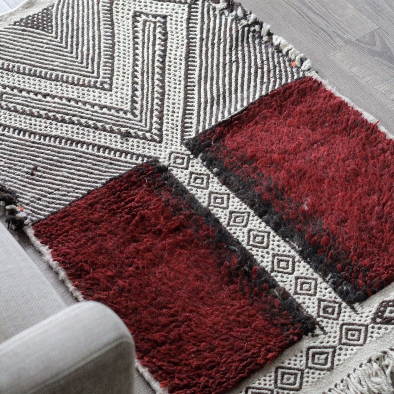 ≪世界の文化の交差点≫と呼ばれているモロッコだからこそ生まれた、ベルベル文化特有の象徴的な幾何学紋様が描かれた特徴的な絨毯です。