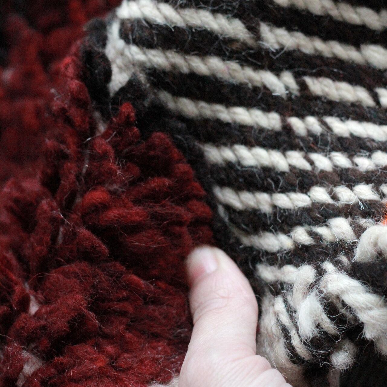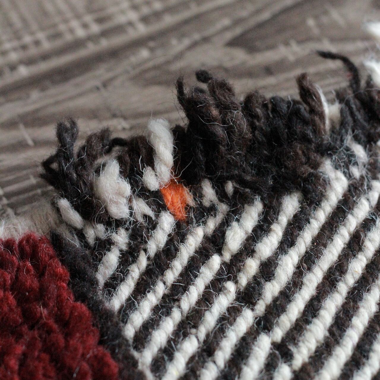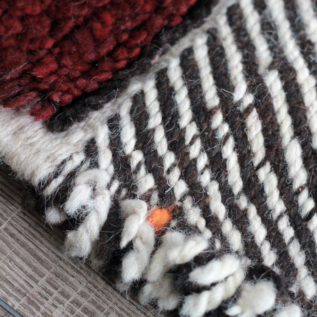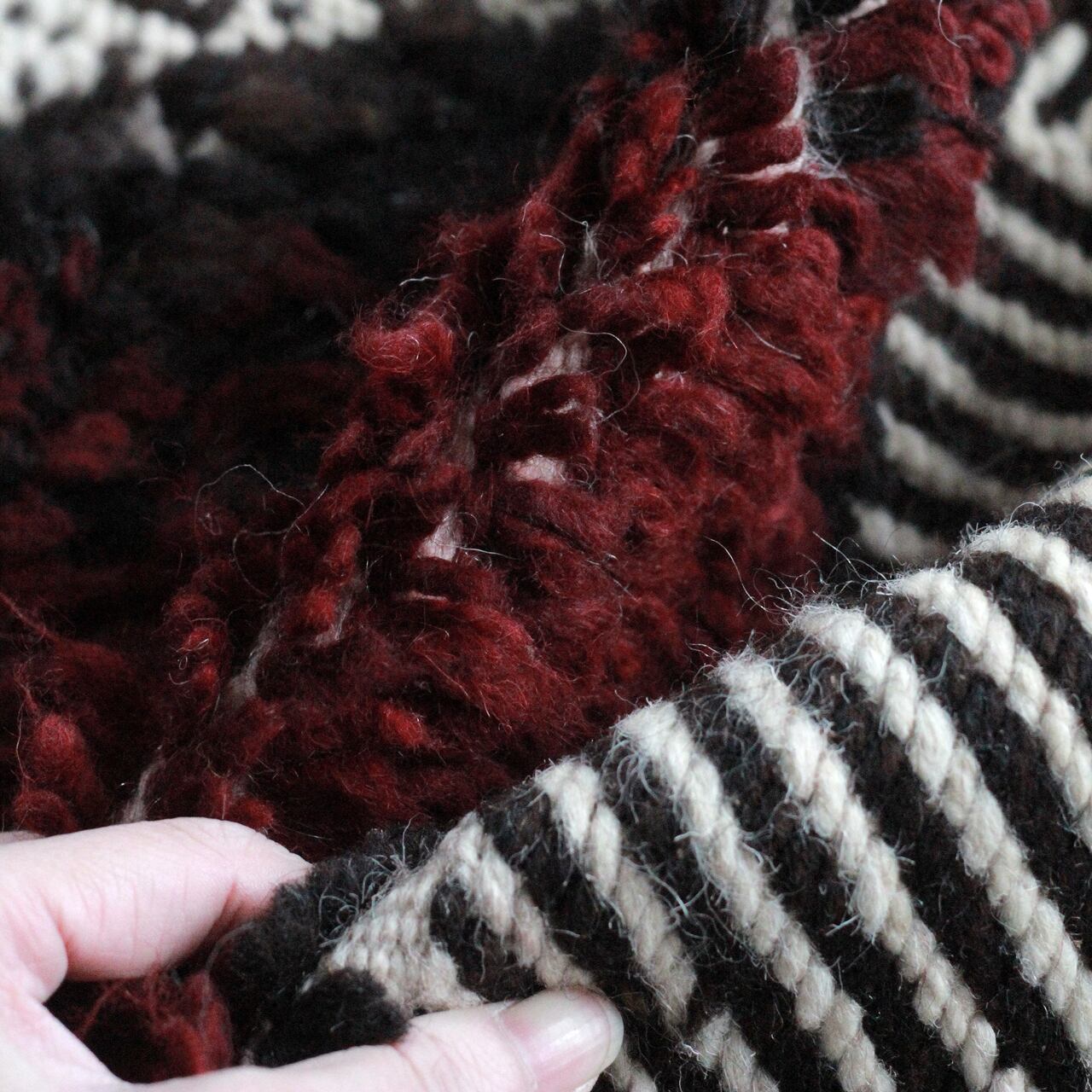 羊毛から染色原料に至るまで、全て自然素材、手作業での逸品となりますので、多少の歪みや色ムラ、糸の混在が見受けられる場合がございますが、手仕事ならではのラフな風合いや温もりを感じていただけますと幸いです。