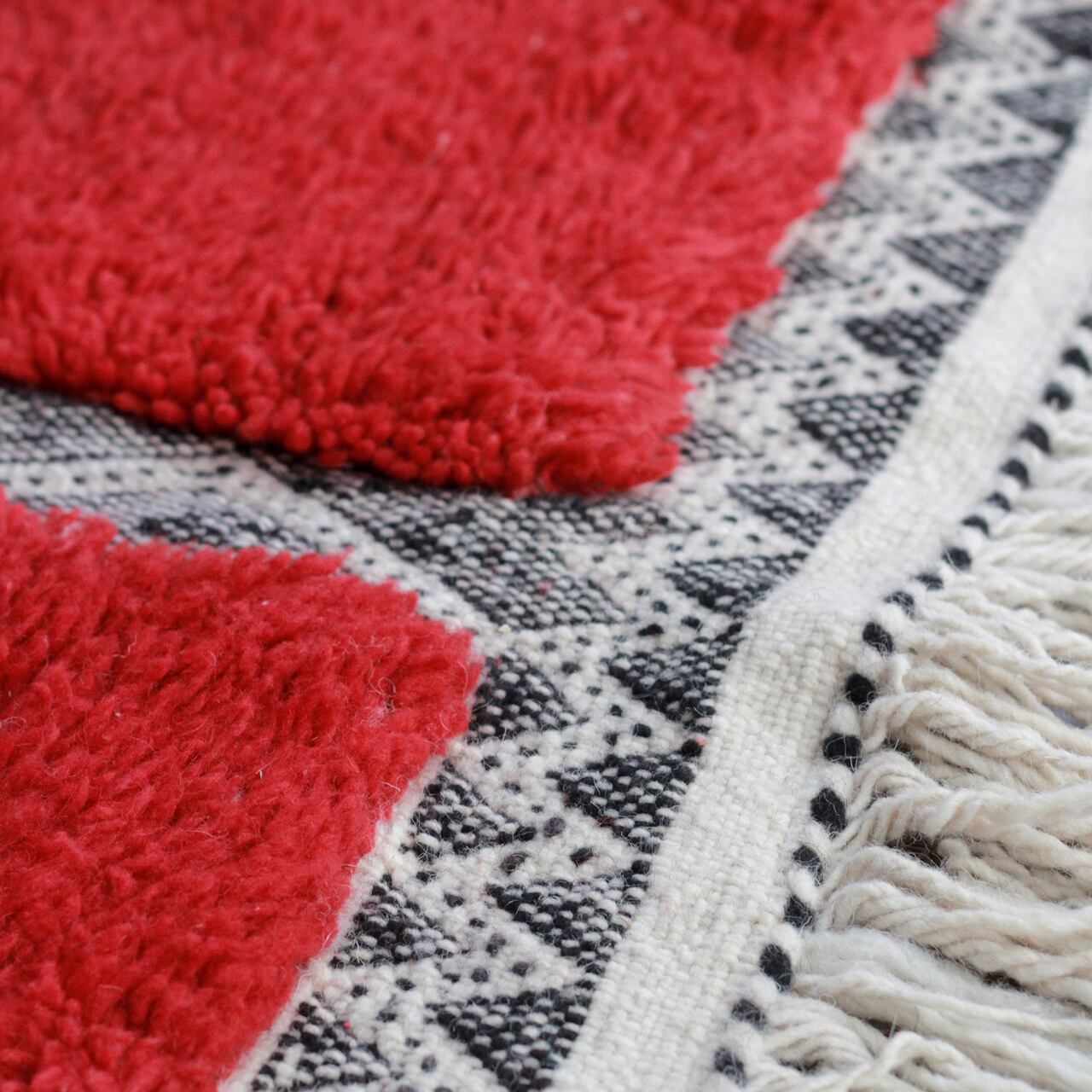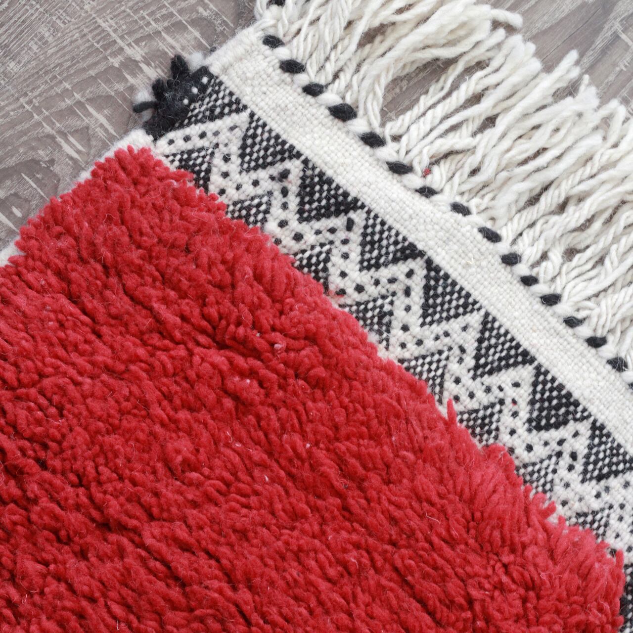毛足のあるパイル織りには、天然染料を使って染め上げたとは思えないほど美しく、パッと目を惹く鮮やかな紅色。