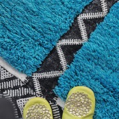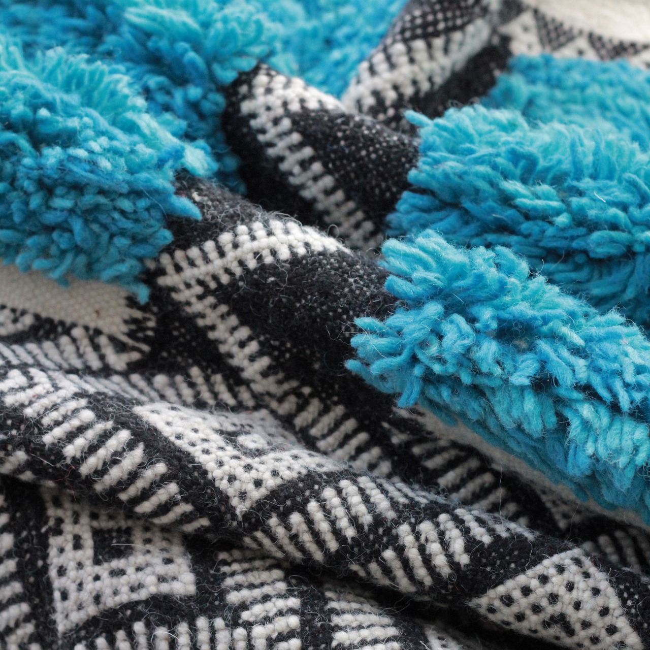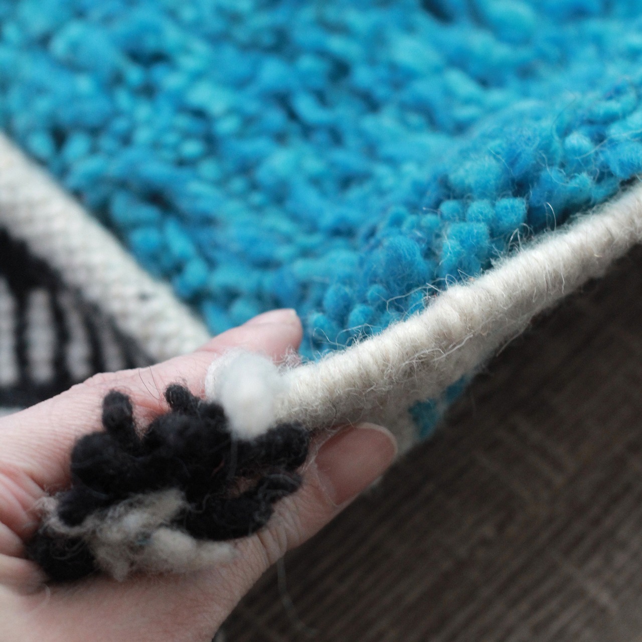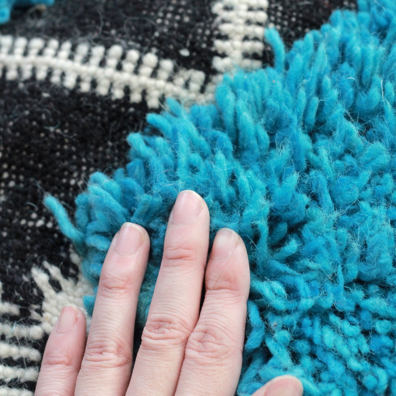 毛足のあるパイル織りには、天然染料を使って染め上げたとは思えないほど美しい、鮮やかな青々としたカラー。