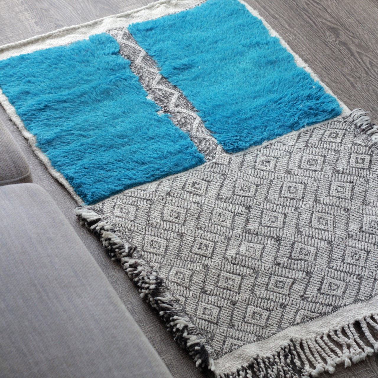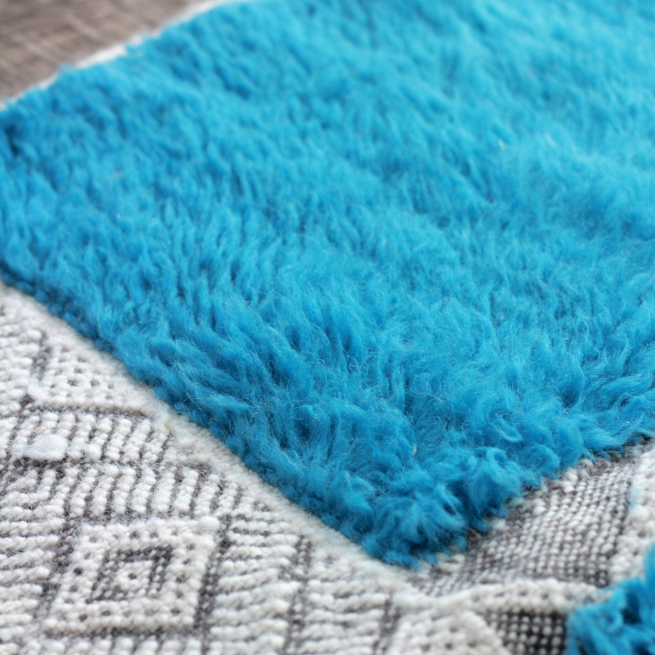 毛足のあるパイル織りには、天然染料を使って染め上げたとは思えないほど鮮やかな青々としたカラー。