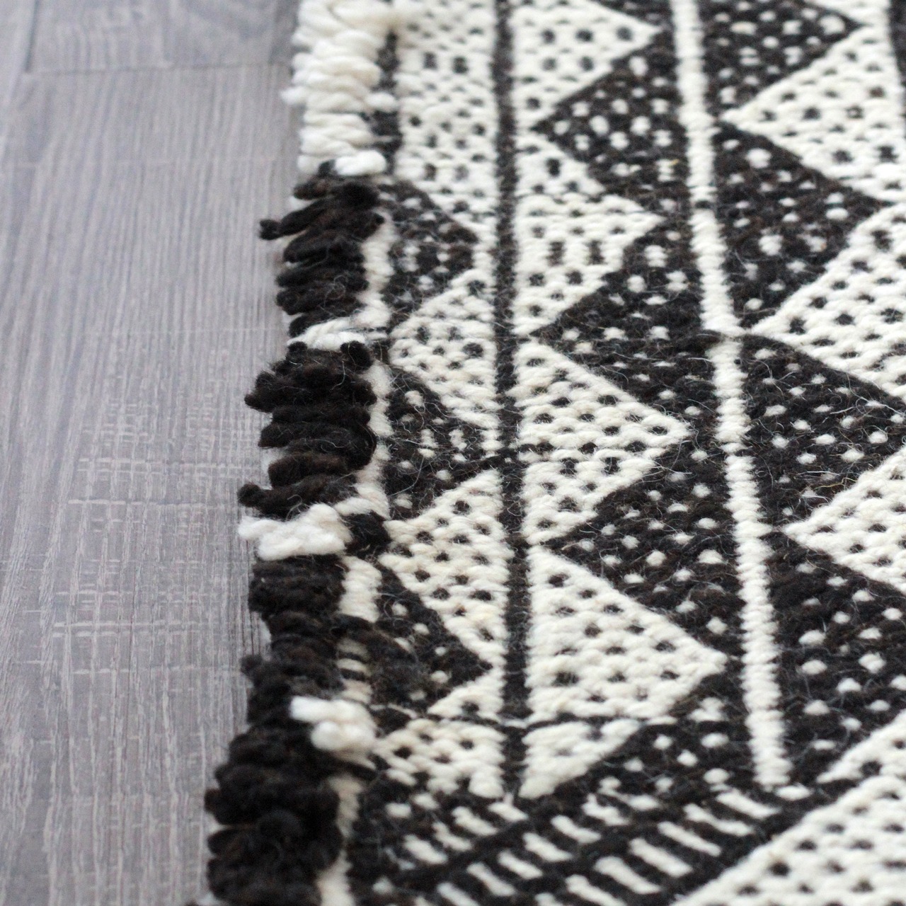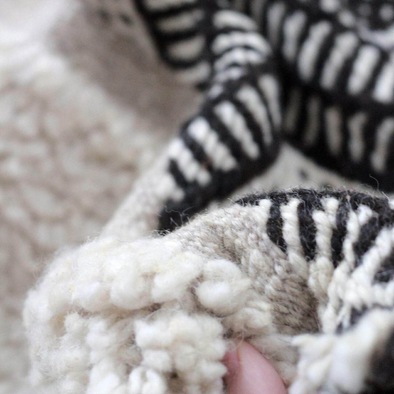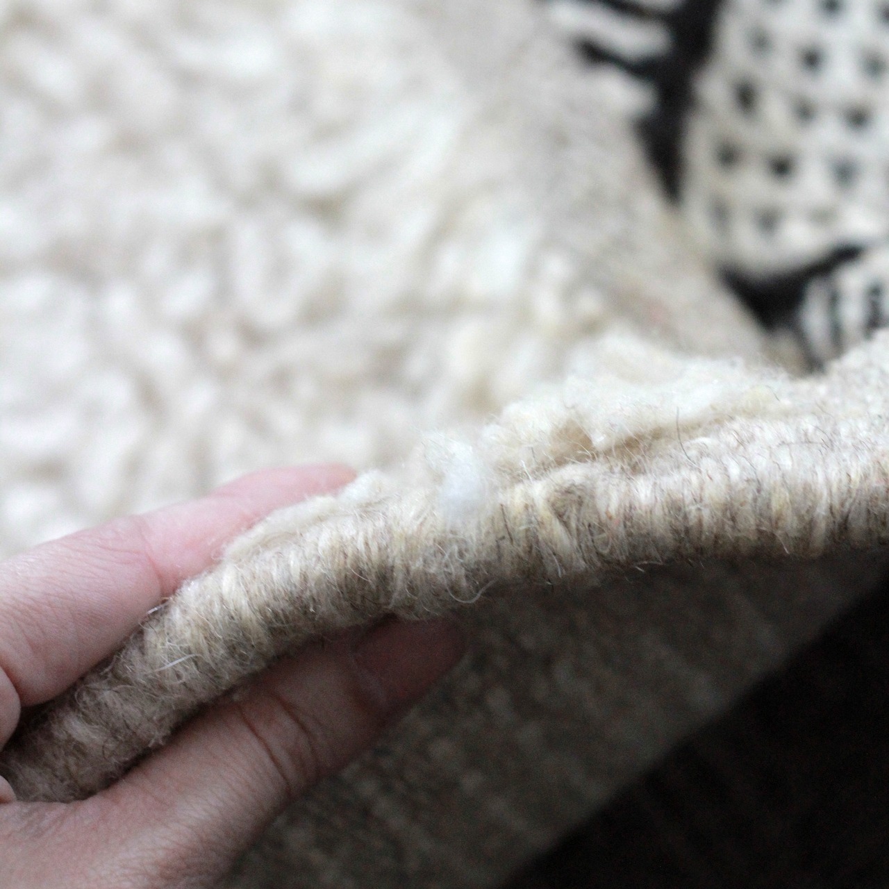 ふっくらとした生成りの毛足と、黒白の幾何学模様が織りなす穏やかなリズムは、まるで土の中で息づく新芽のよう。