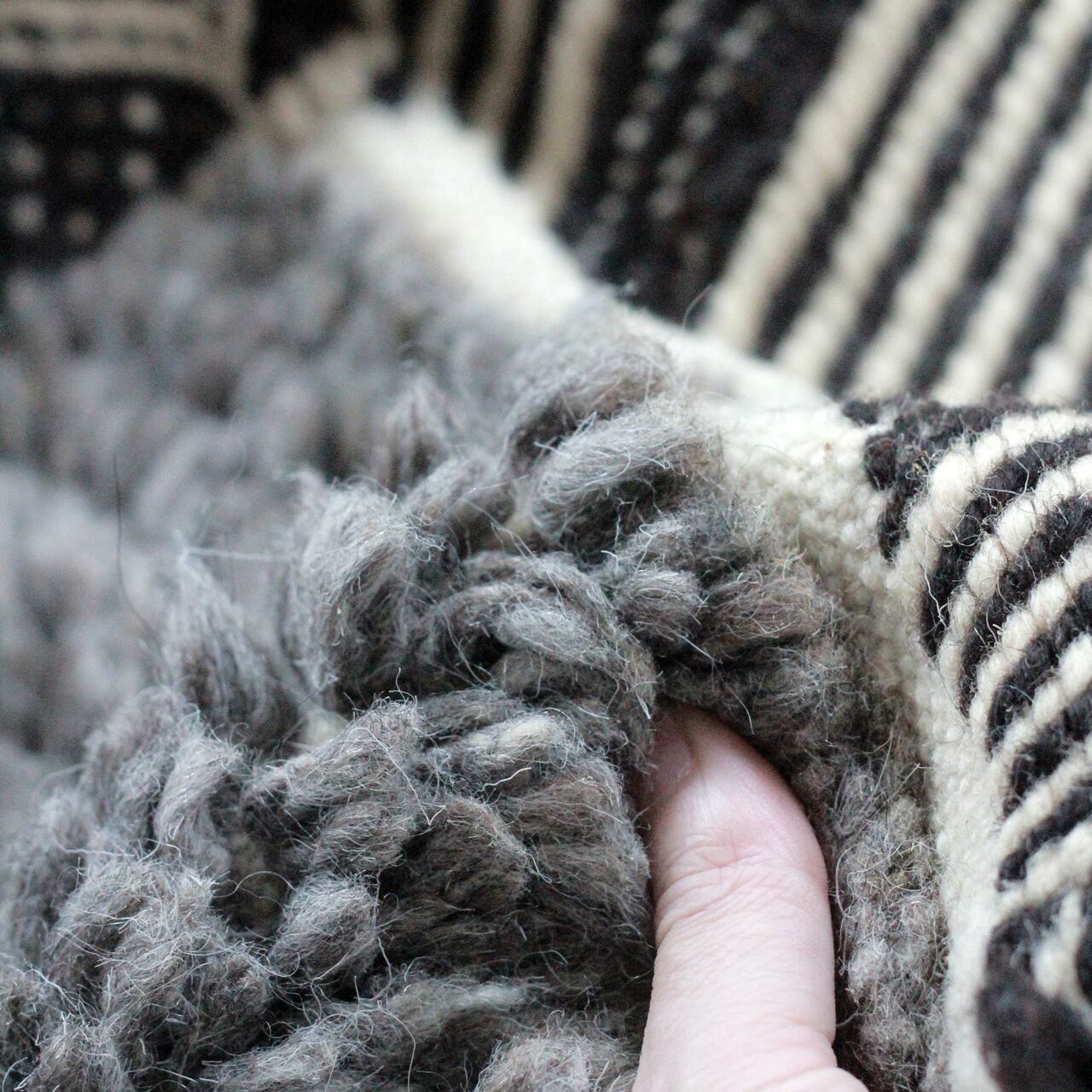 やさしいグレーの毛足とリズムあるジグザグ模様が、静かな動きを宿した1枚。