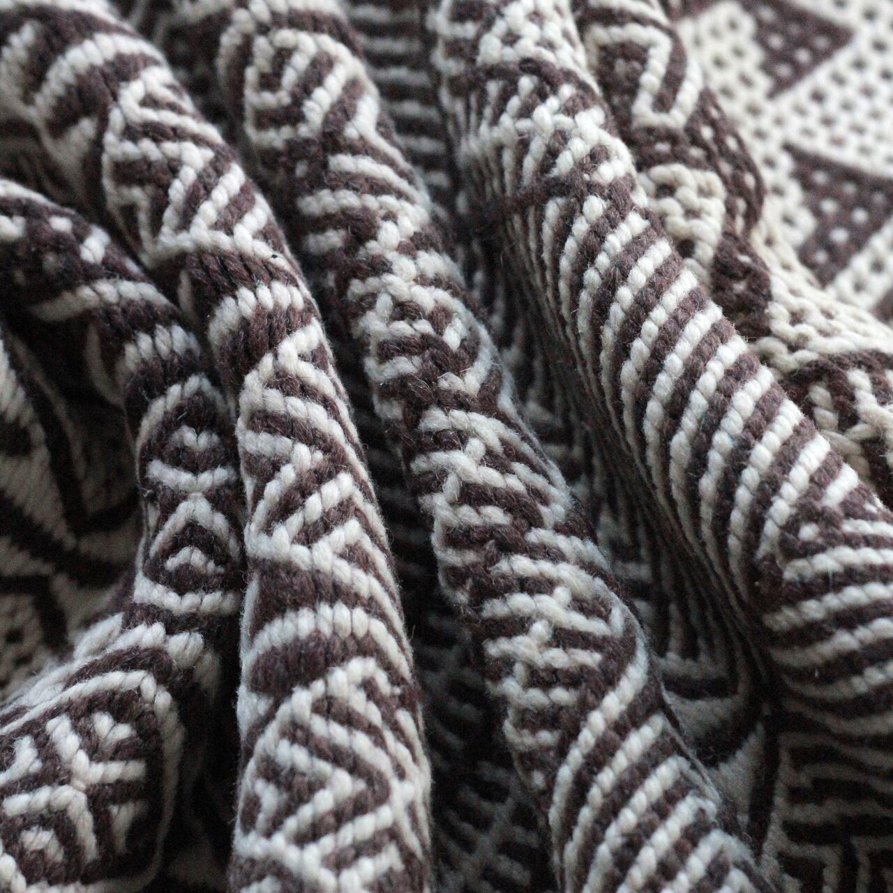 白と焦茶のコントラストで織られた幾何学模様は、どこか建築的でありながら、風や音のような柔らかさも帯びていて。