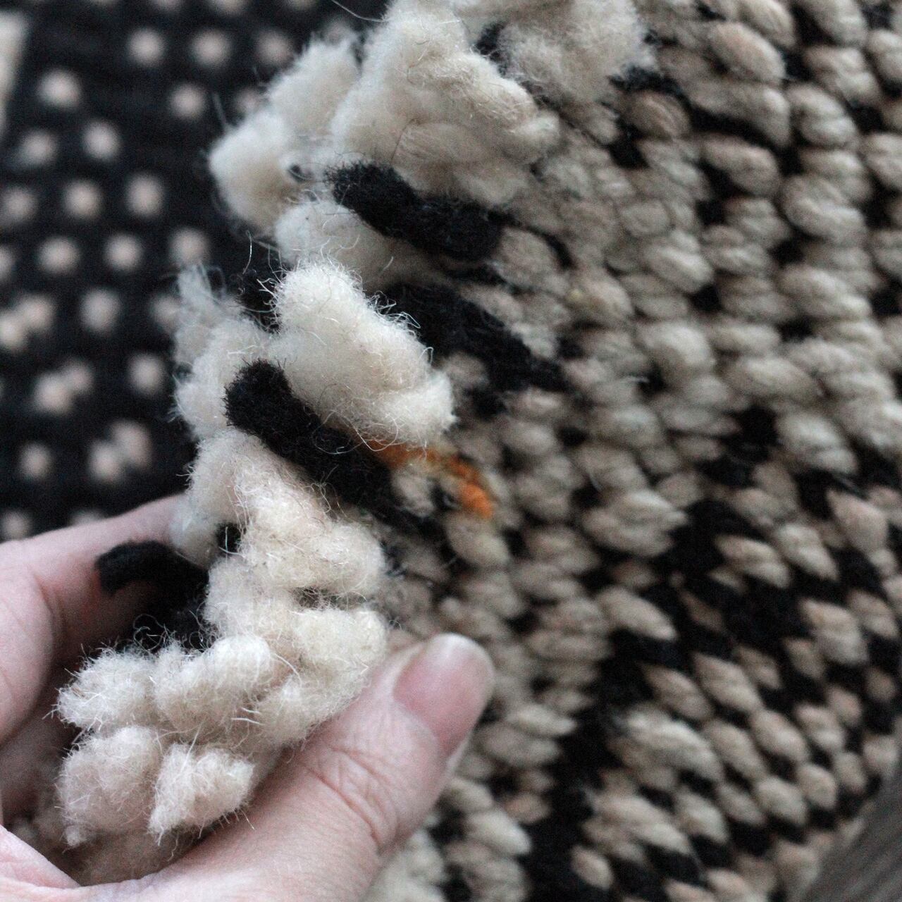 羊毛から染色原料に至るまで、全て自然素材、手作業での逸品となりますので、多少の歪みや色ムラ、糸の混在が見受けられる場合がございますが、手仕事ならではのラフな風合いや温もりを感じていただけますと幸いです。