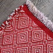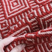 深く染められた紅のベースに、アイボリーで浮かび上がる幾何学模様。