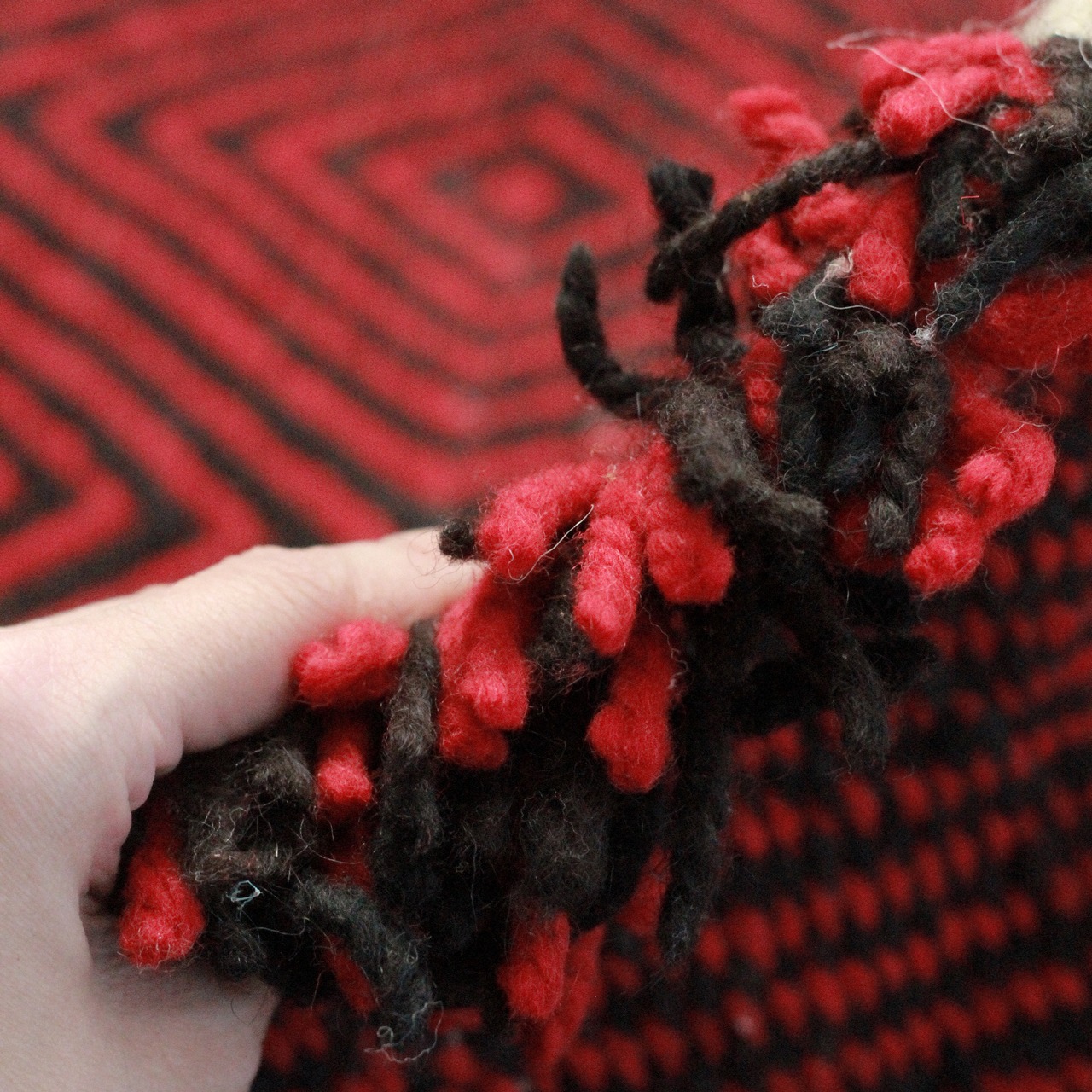 羊毛から染色原料に至るまで、全て自然素材、手作業での逸品となりますので、多少の歪みや色ムラ、糸の混在が見受けられる場合がございますが、手仕事ならではのラフな風合いや温もりを感じていただけますと幸いです。