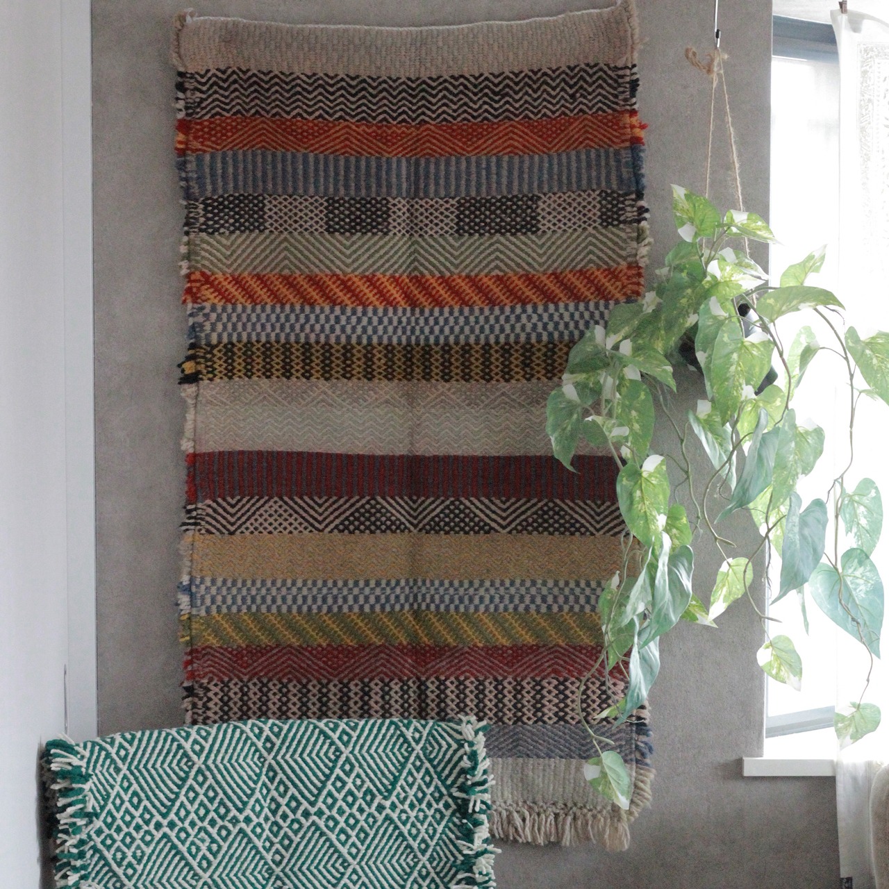 羊毛から染色原料に至るまで、全て自然素材、手作業での逸品となりますので、多少の歪みや色ムラ、糸の混在が見受けられる場合がございますが、手仕事ならではのラフな風合いや温もりを感じていただけますと幸いです。