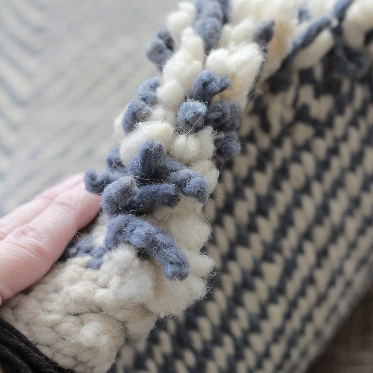羊毛から染色原料に至るまで、全て自然素材、手作業での逸品となりますので、多少の歪みや色ムラ、糸の混在が見受けられる場合がございますが、手仕事ならではのラフな風合いや温もりを感じていただけますと幸いです。