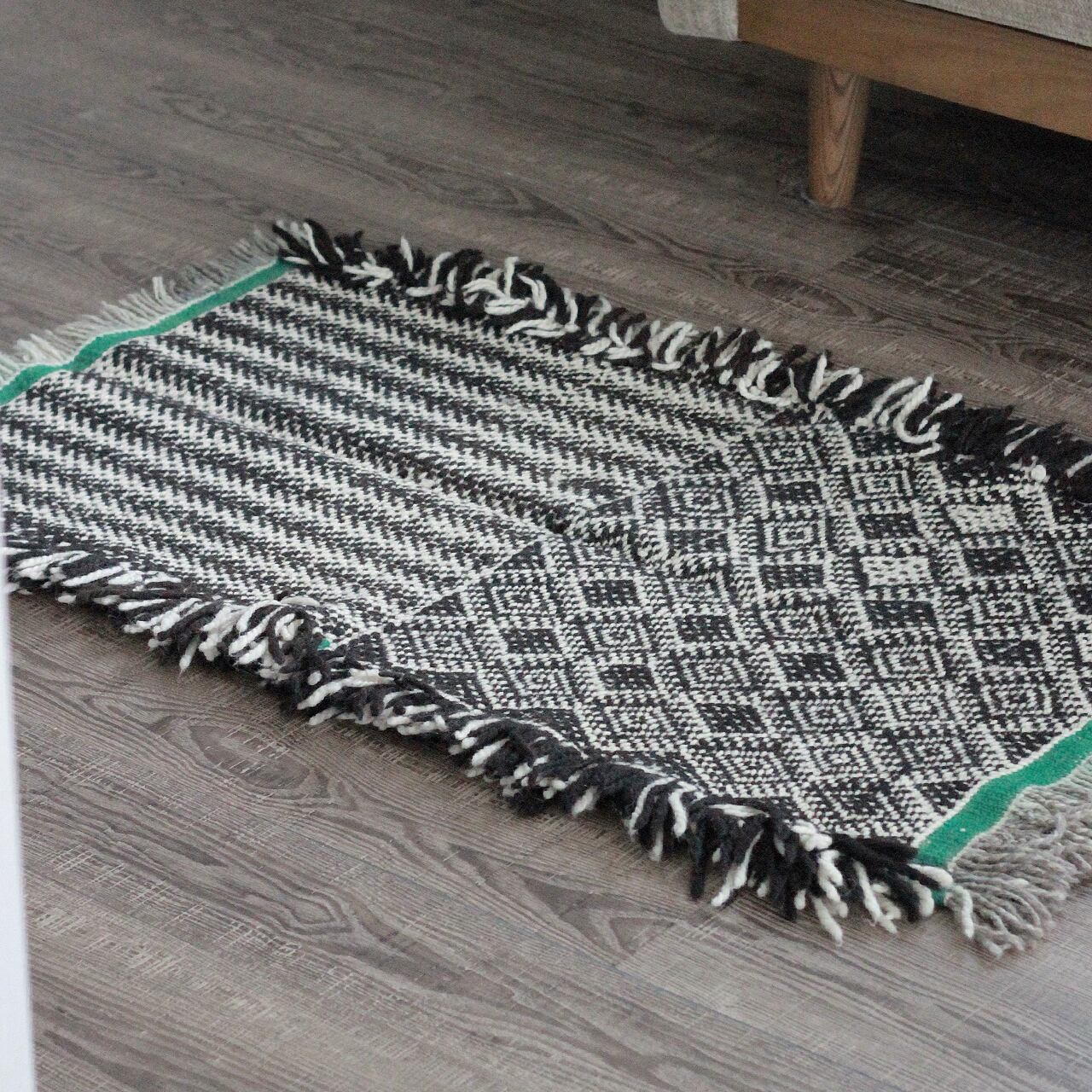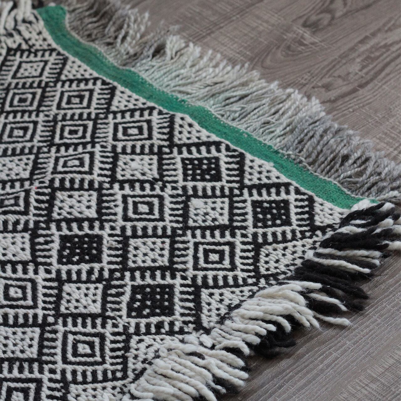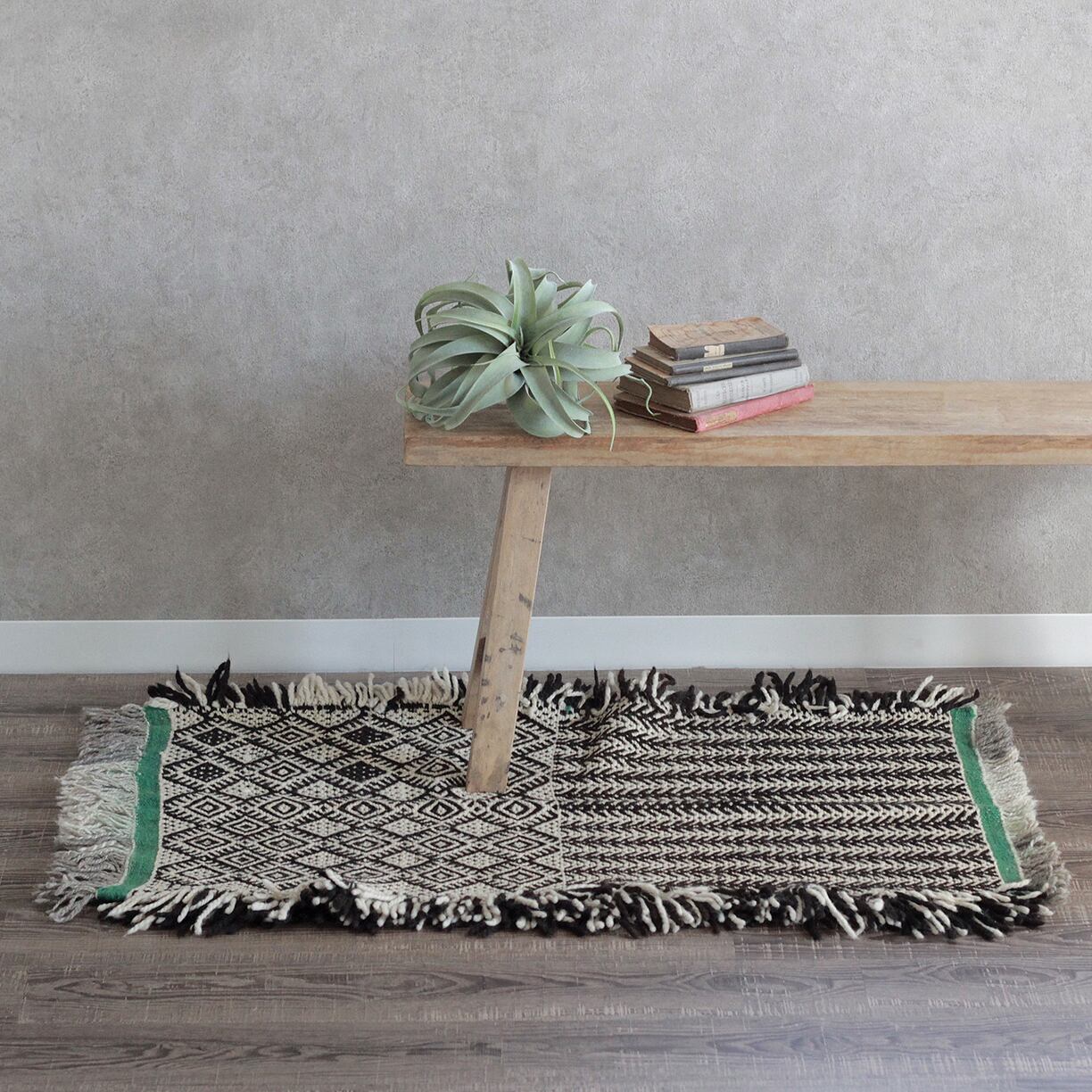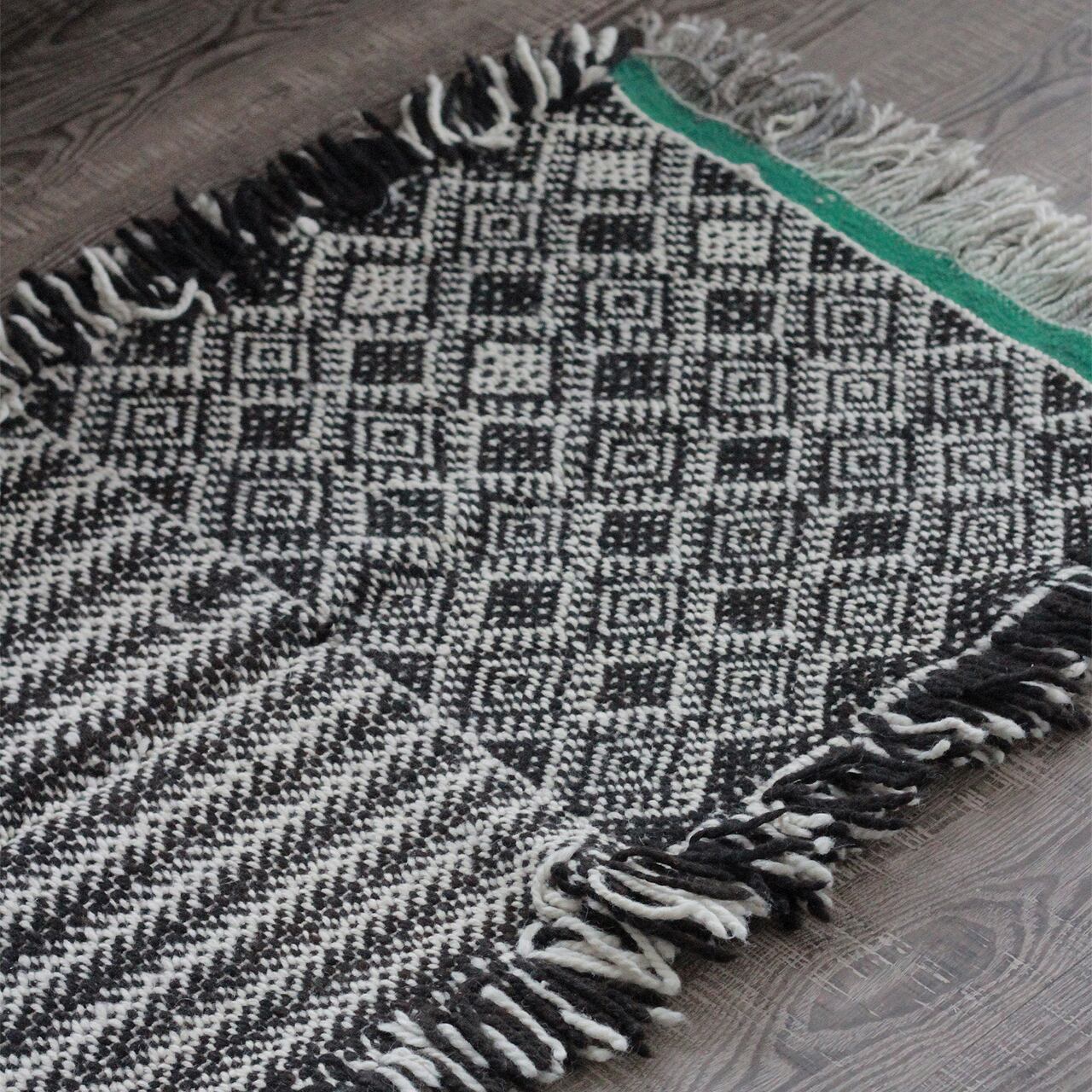 先人たちの失われた伝統を受け継いで、羊毛を手紡ぎ人の手で丁寧に織られたこだわりのスモールラグです。