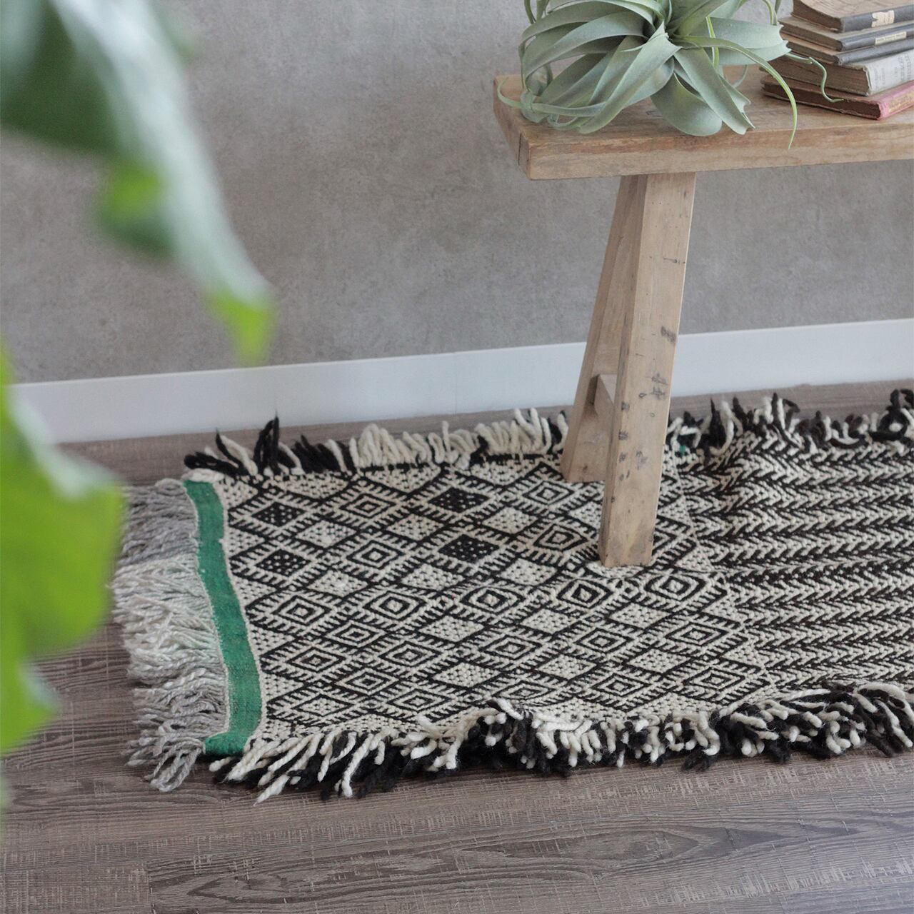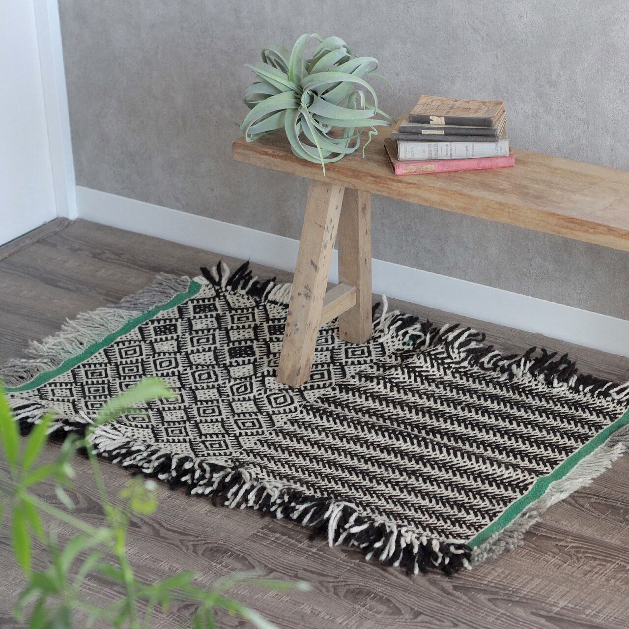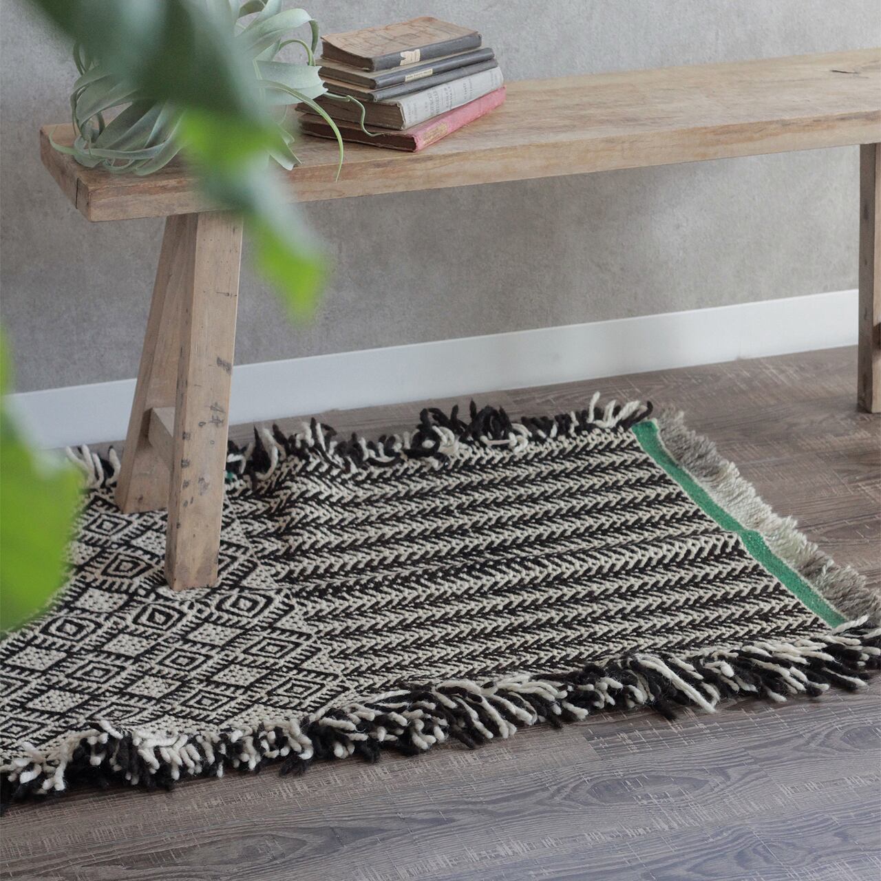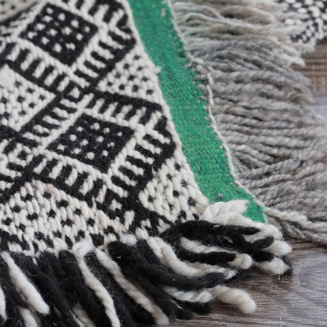 先人たちの失われた伝統を受け継いで、羊毛を手紡ぎ人の手で丁寧に織られたこだわりのスモールラグです。