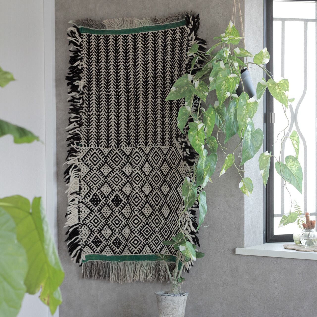 贅沢に四方に施されたボリュームたっぷりのフリンジは、どこか余裕のある佇まいです。