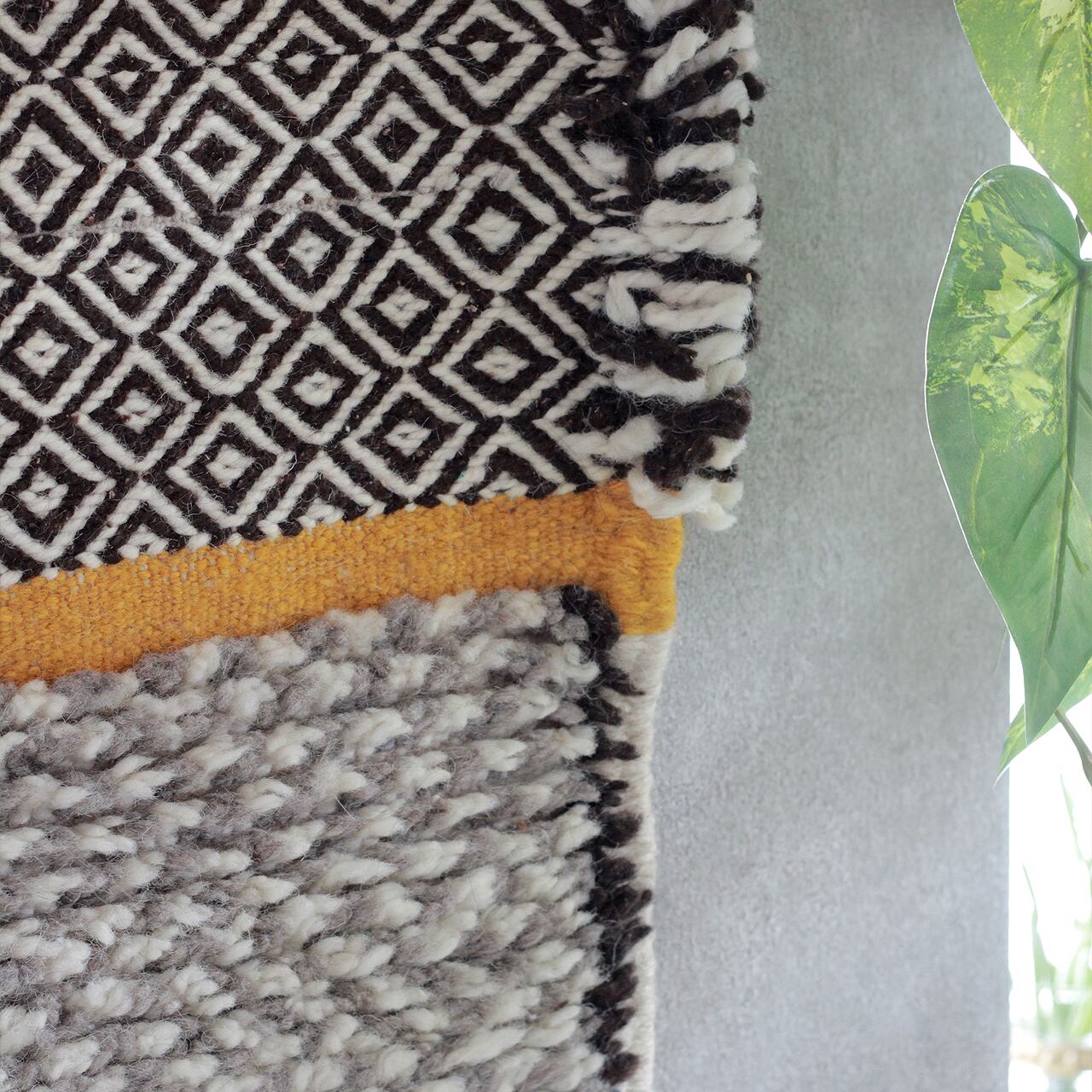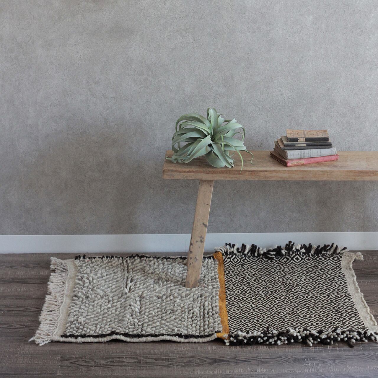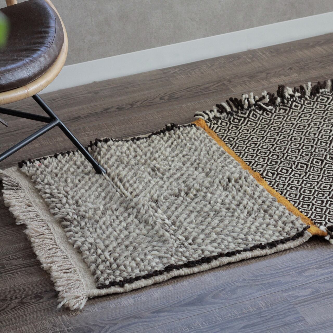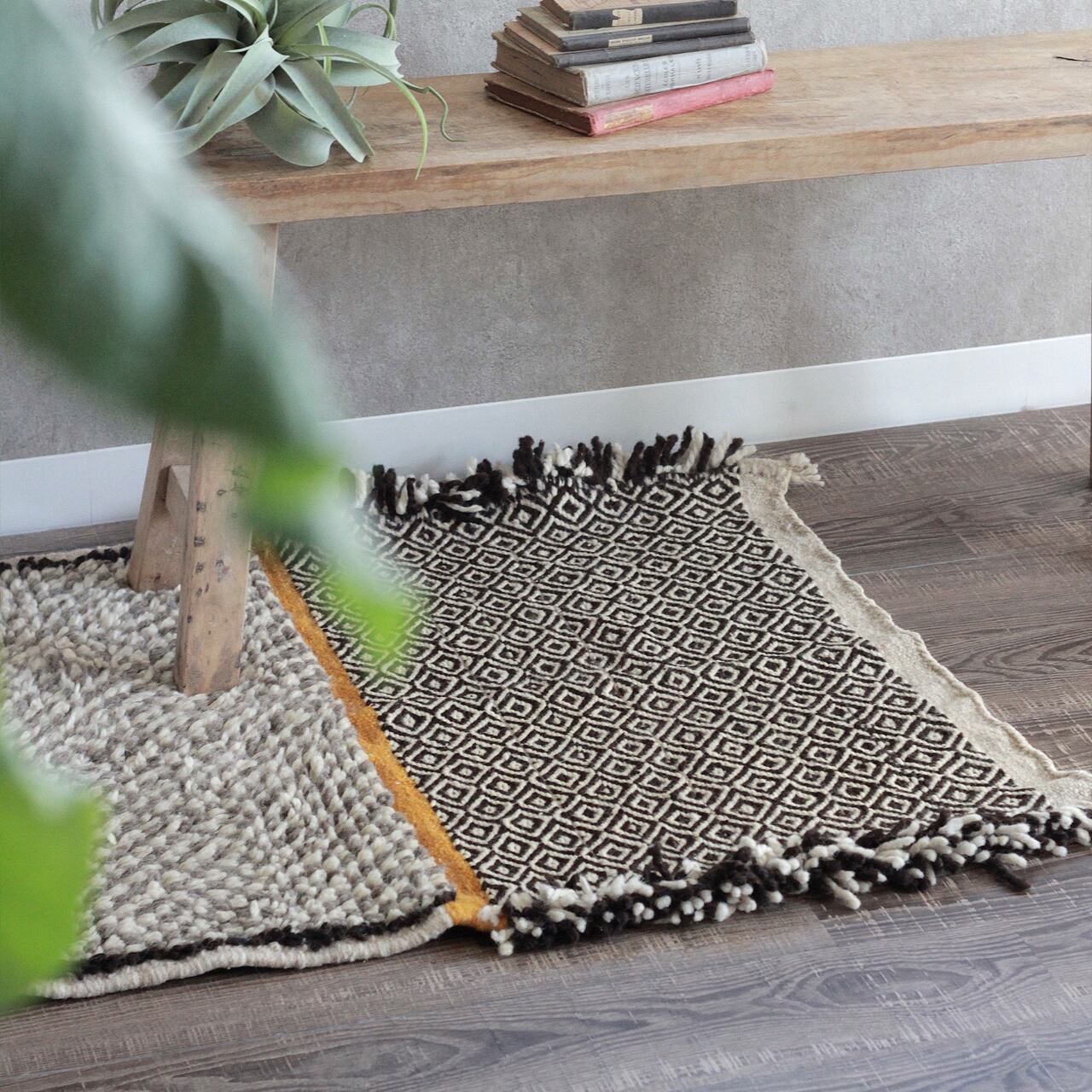 先人たちの失われた伝統を受け継いで、羊毛を手紡ぎ人の手で丁寧に織られたこだわりのスモールラグです。