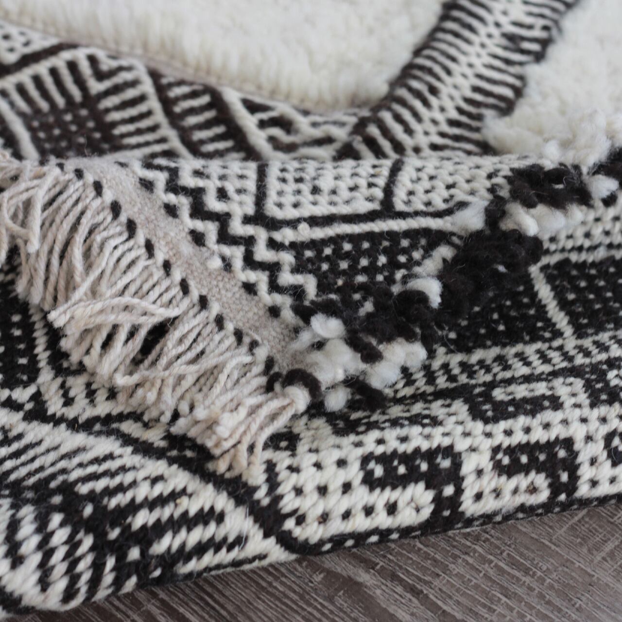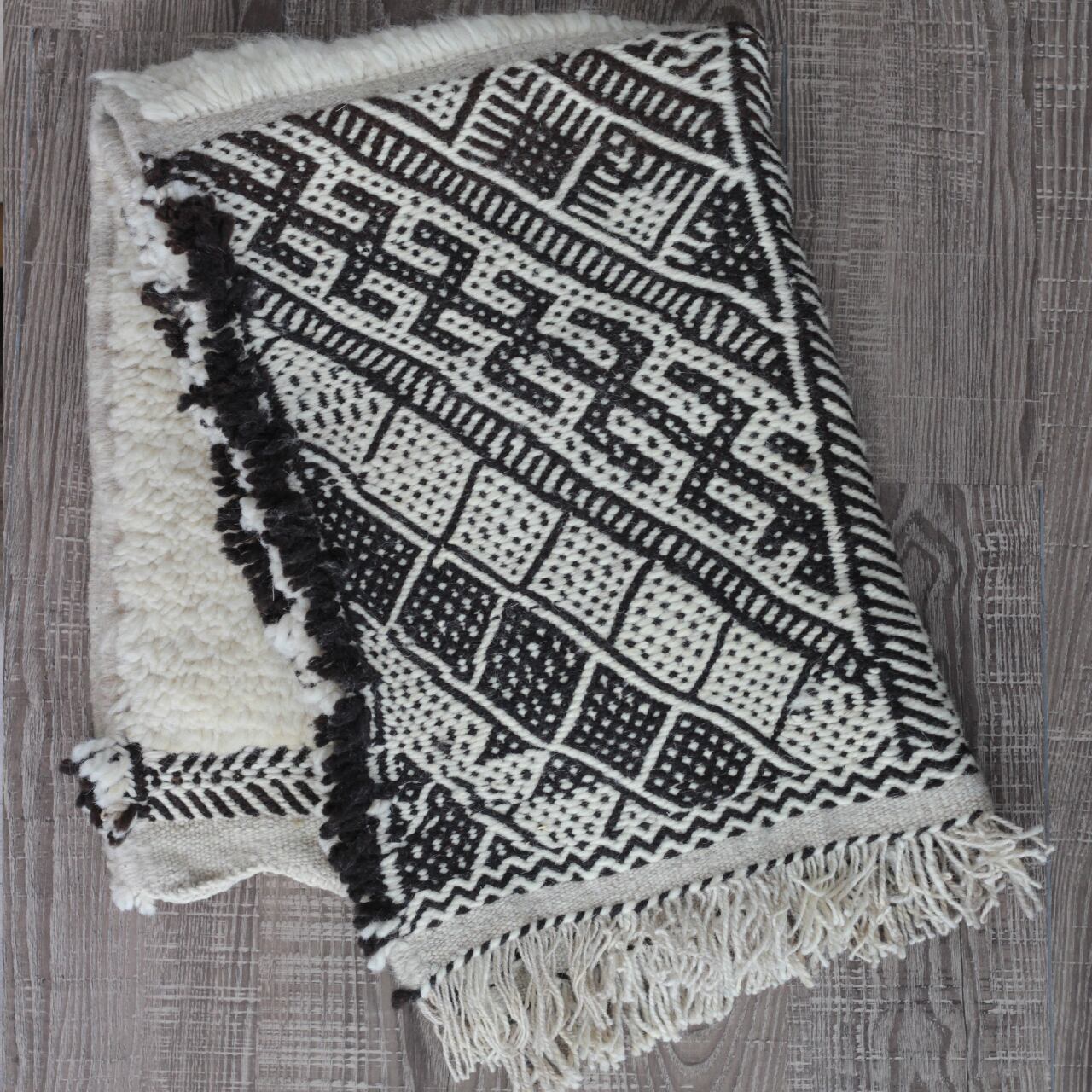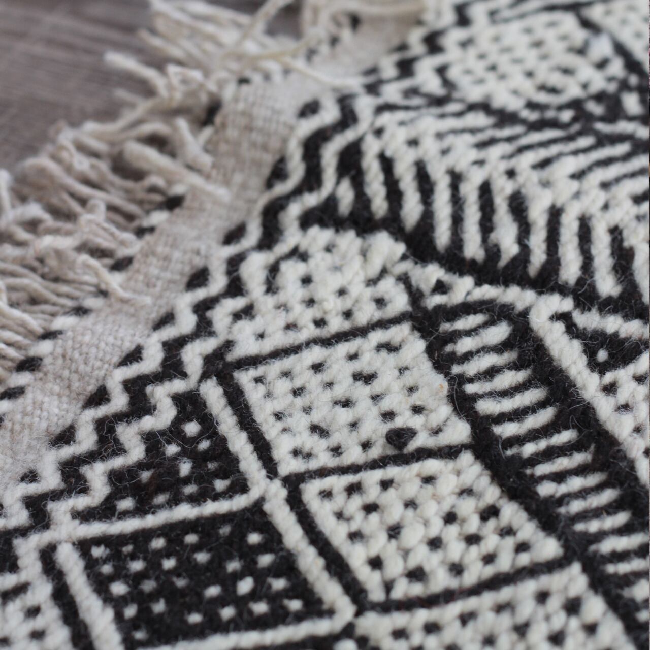先人たちの失われた伝統を受け継いで、羊毛を手紡ぎ人の手で丁寧に織られたこだわりのスモールラグです。