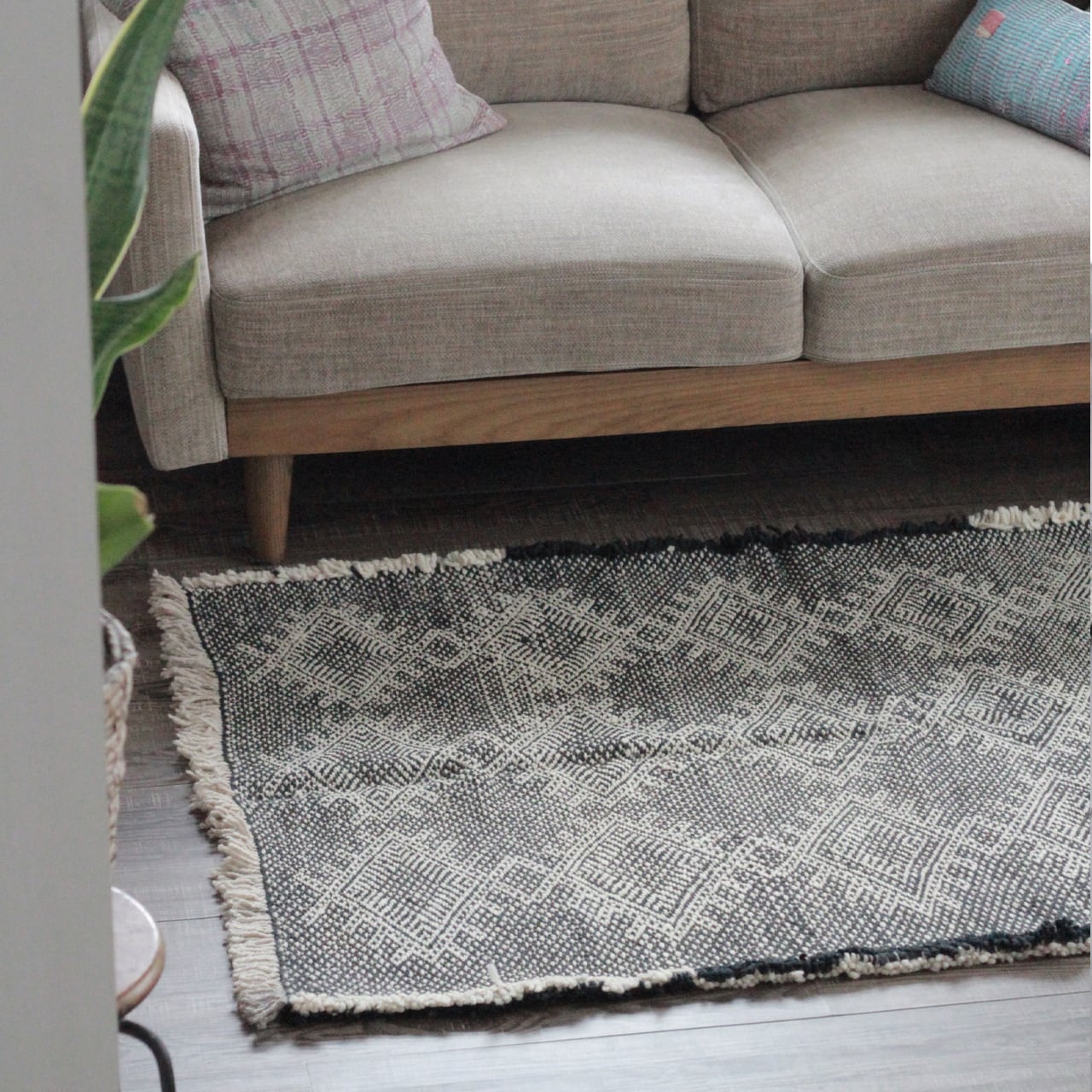 シンプルでありながらも、数種類の菱紋様が描かれた織りは敷き方ひとつで多数の表情が楽しめます。
