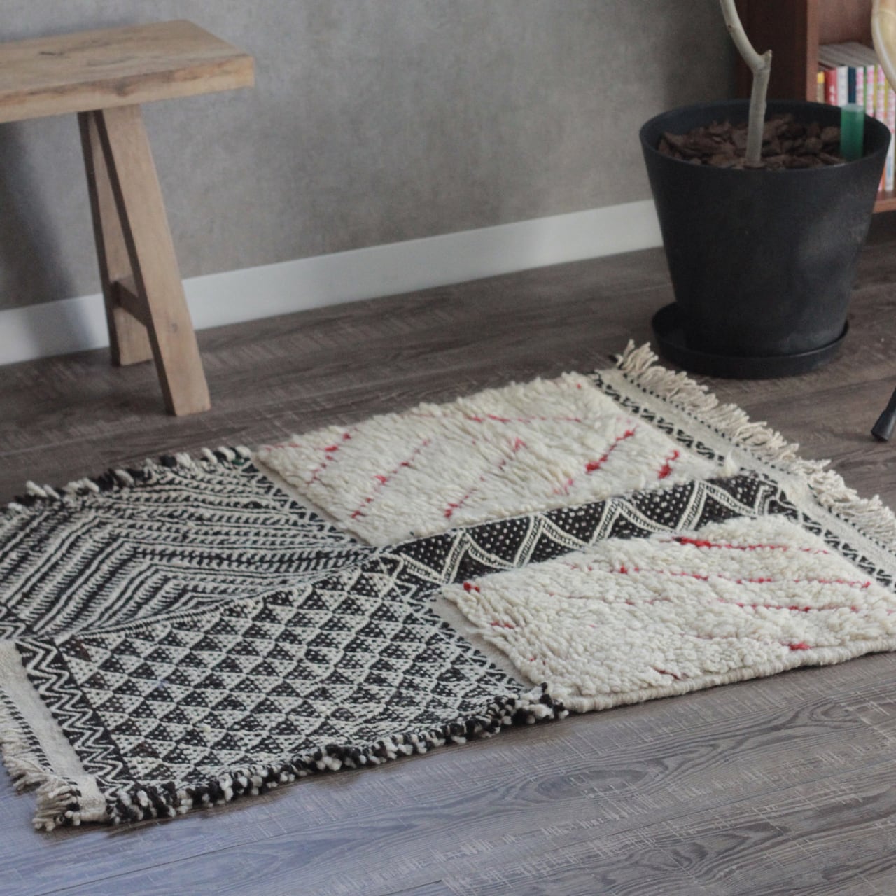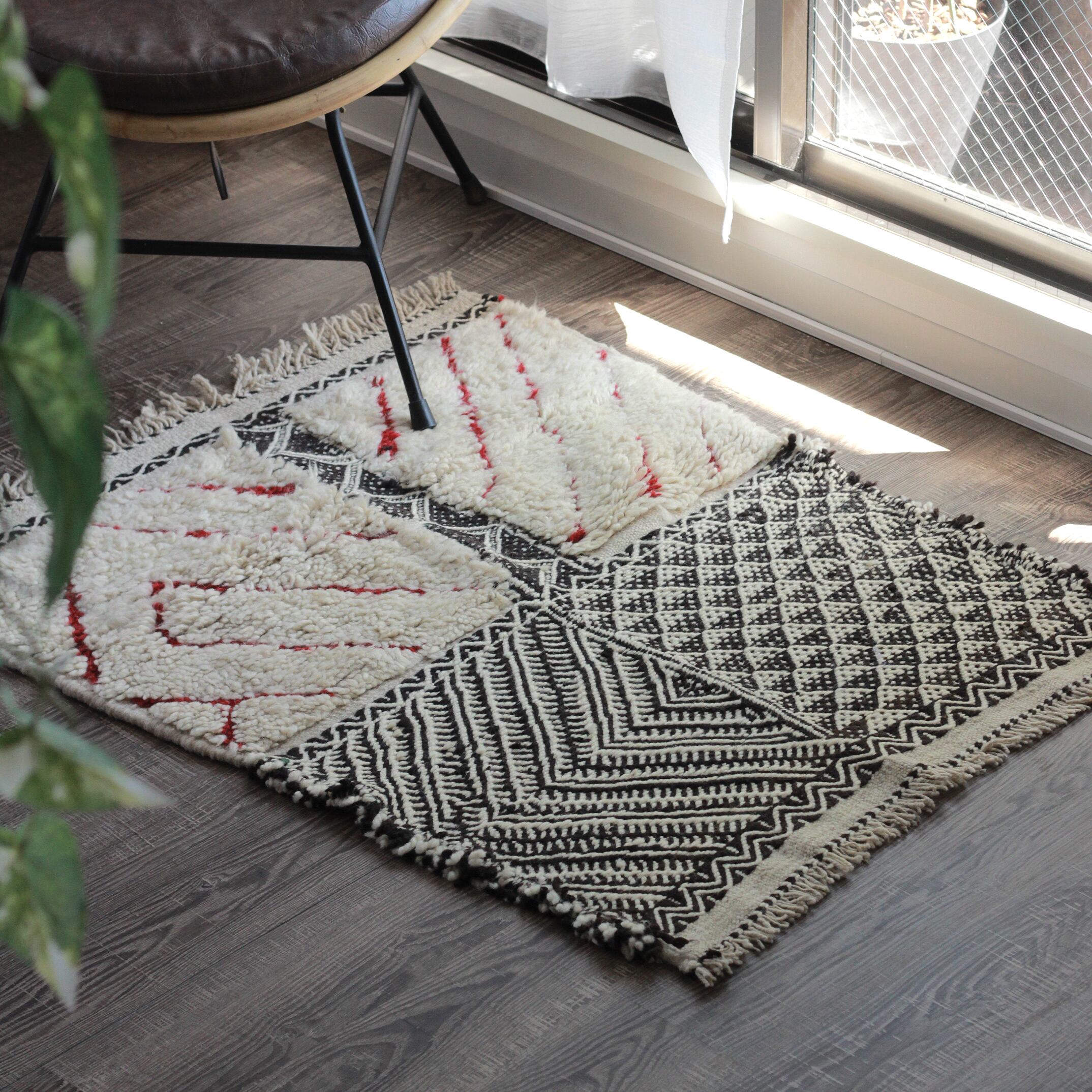 モロッコ先住民 ベルベル民族の日々の暮らしから生まれた伝統的な絨毯は、半分キリム織りだ気持ちの良い足ざわりで、オールシーズンお楽しみいただけます。