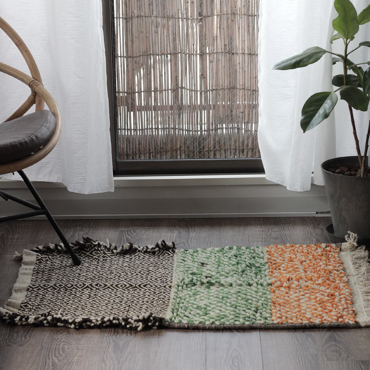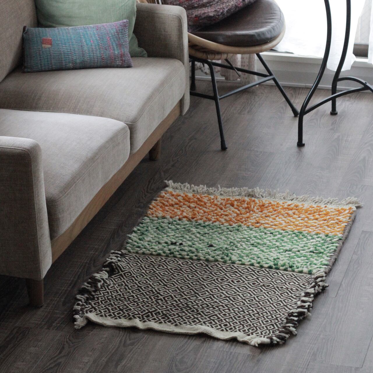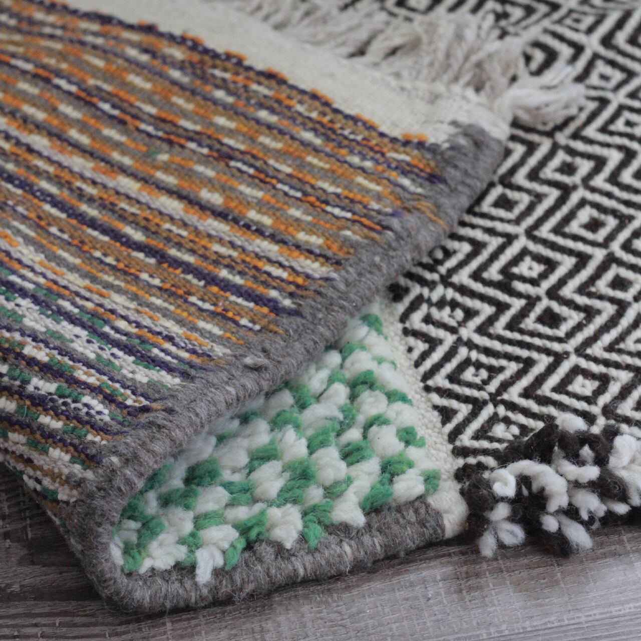 先人たちの失われた伝統を受け継いで、羊毛を手紡ぎ人の手で丁寧に織られたこだわりのスモールラグです。