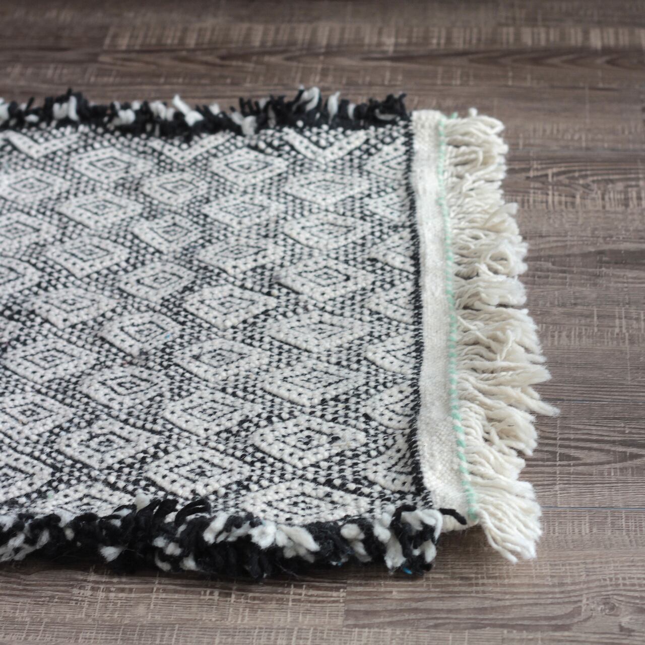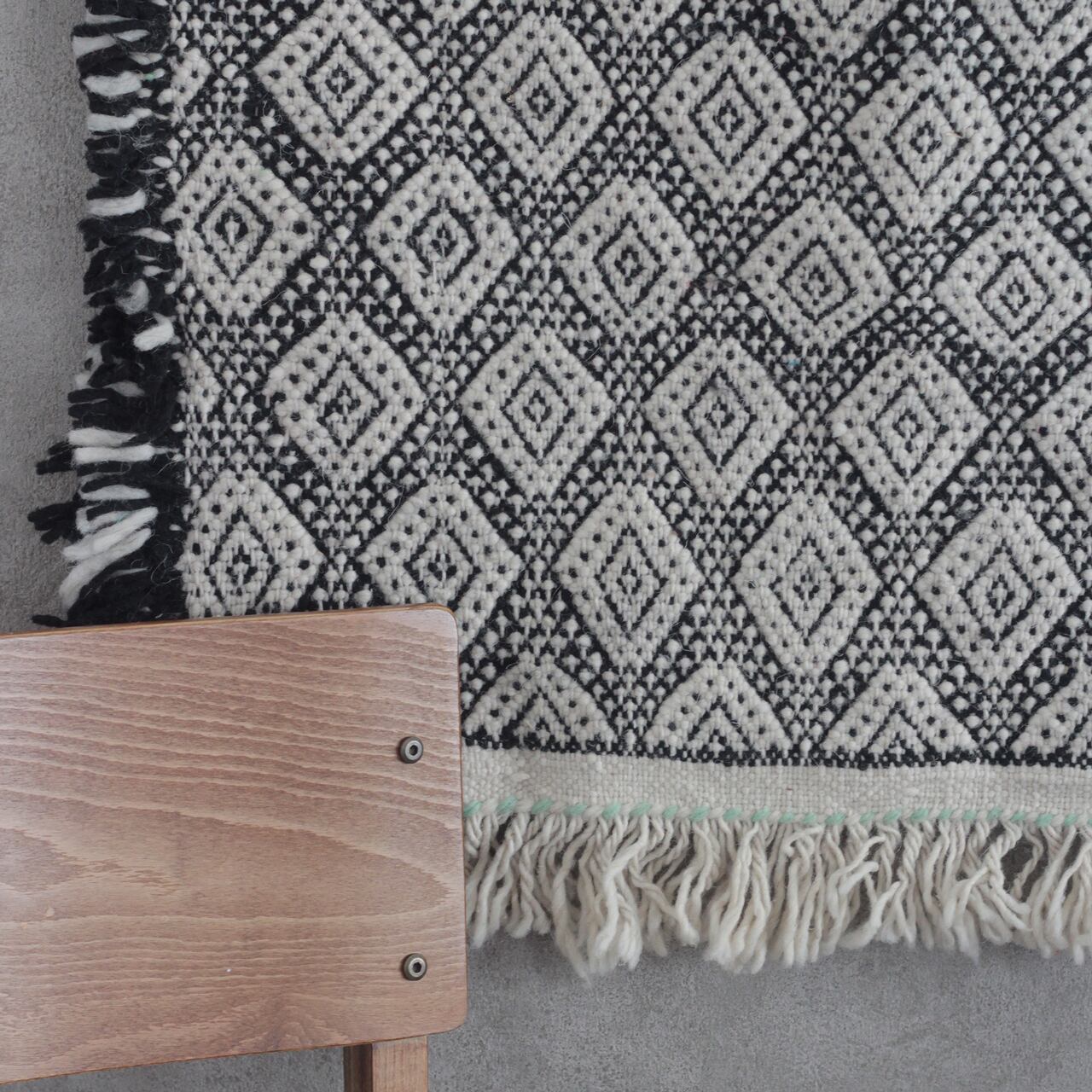 先人たちの失われた伝統を受け継いで、羊毛を手紡ぎ人の手で丁寧に織られたこだわりのスモールラグです。