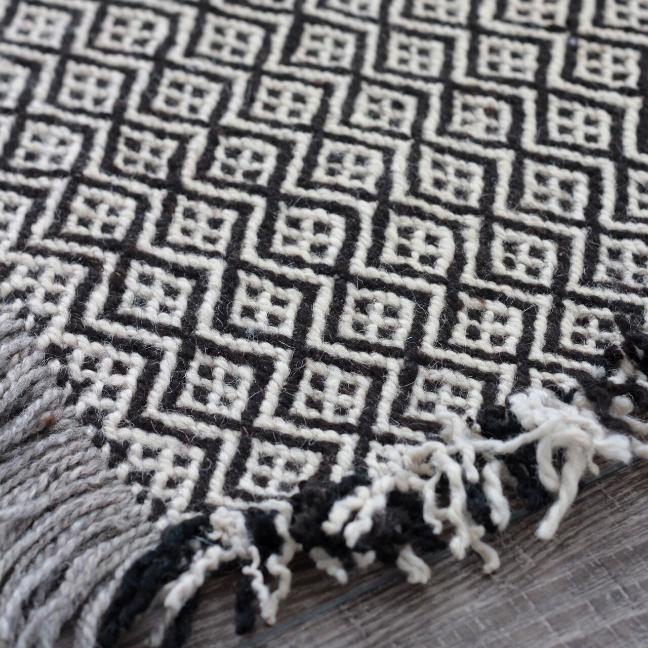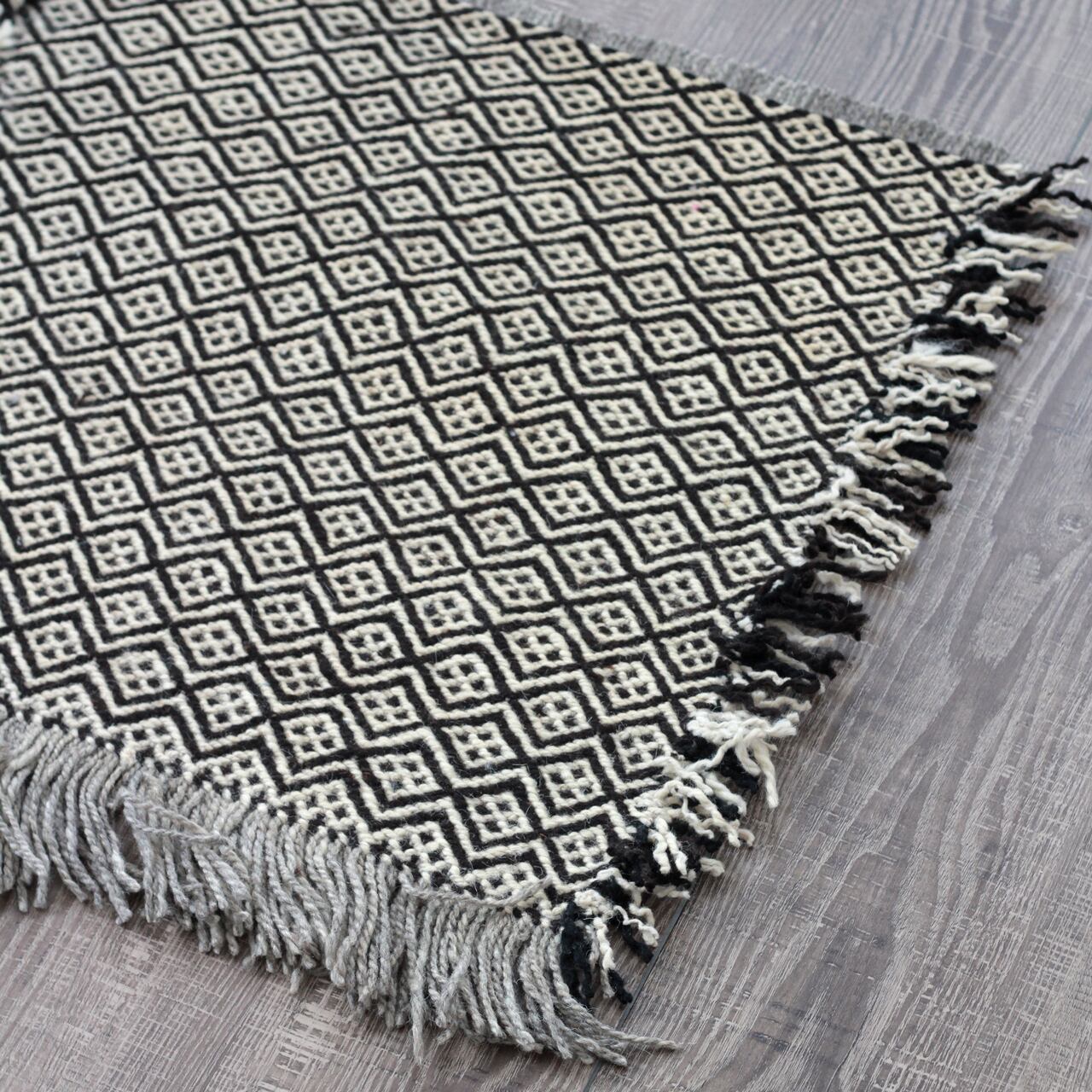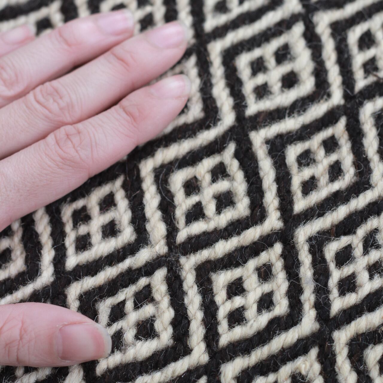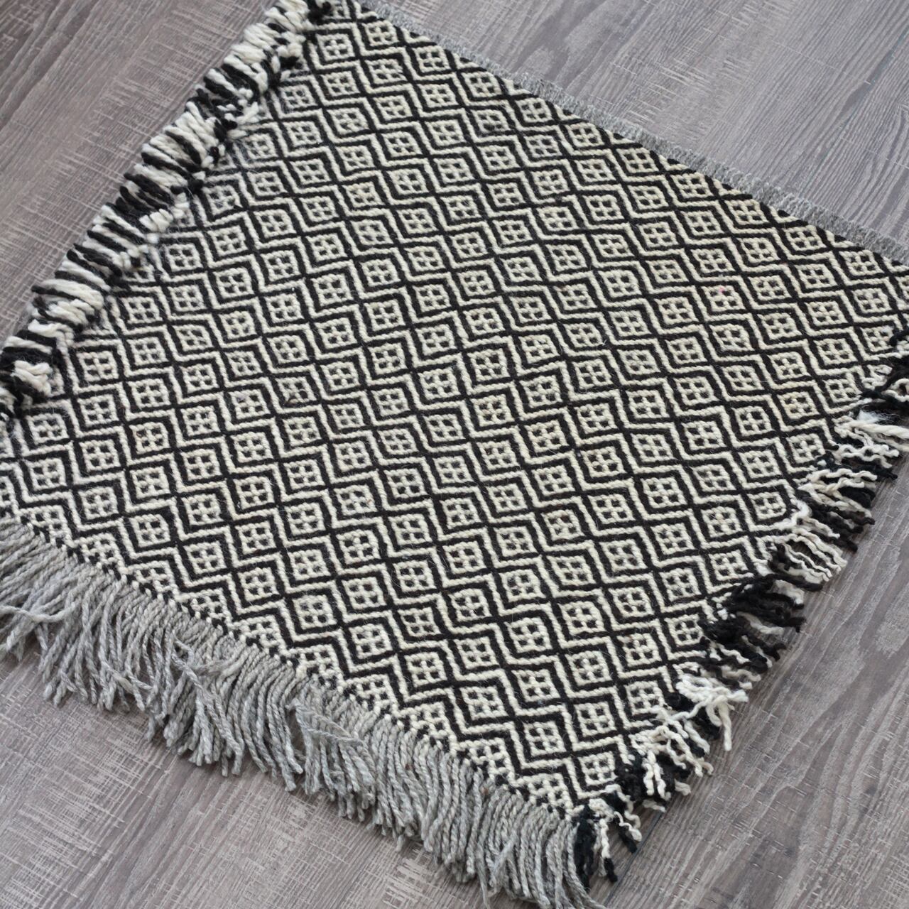 先人たちの失われた伝統を受け継いで、羊毛を手紡ぎ人の手で丁寧に織られたこだわりのスモールラグです。