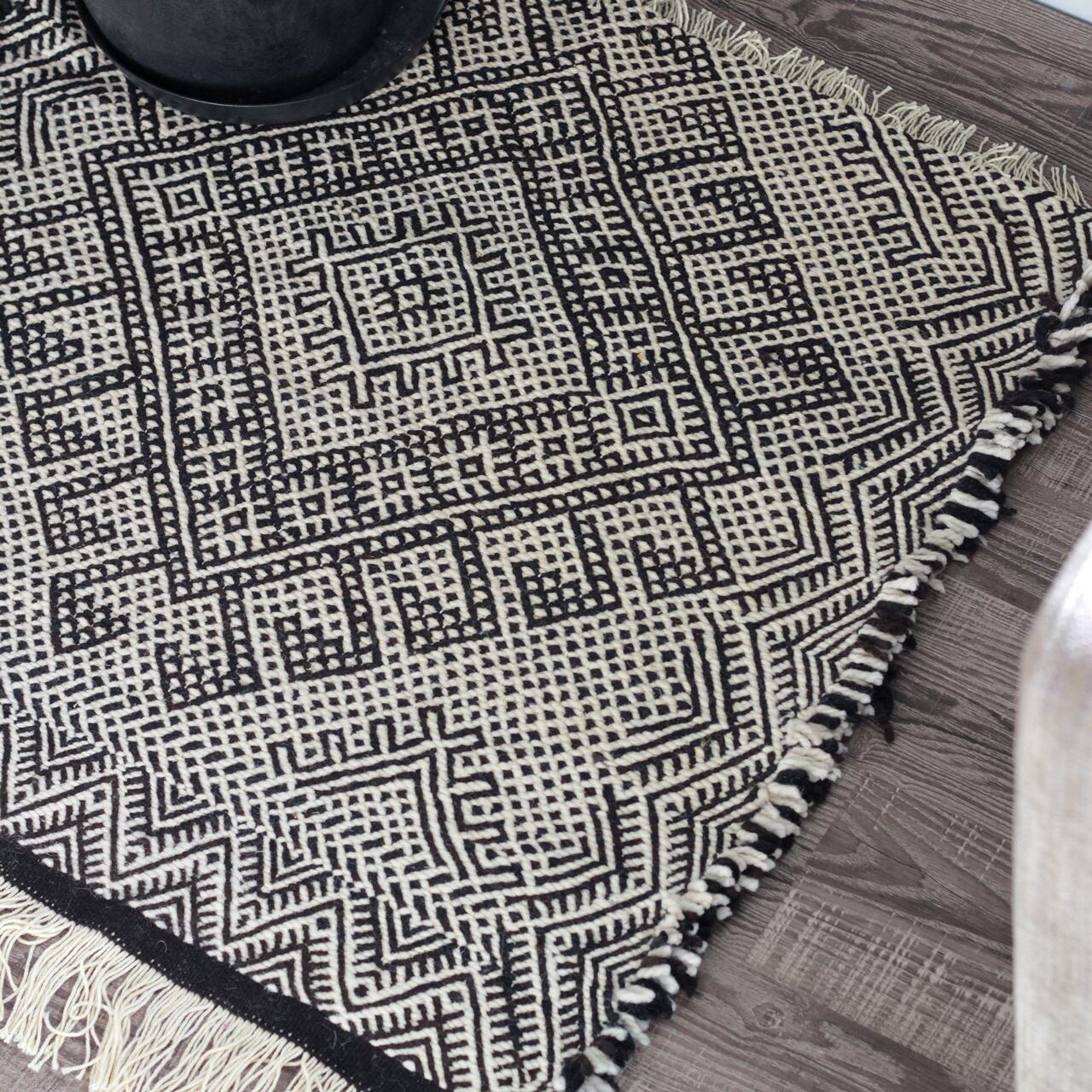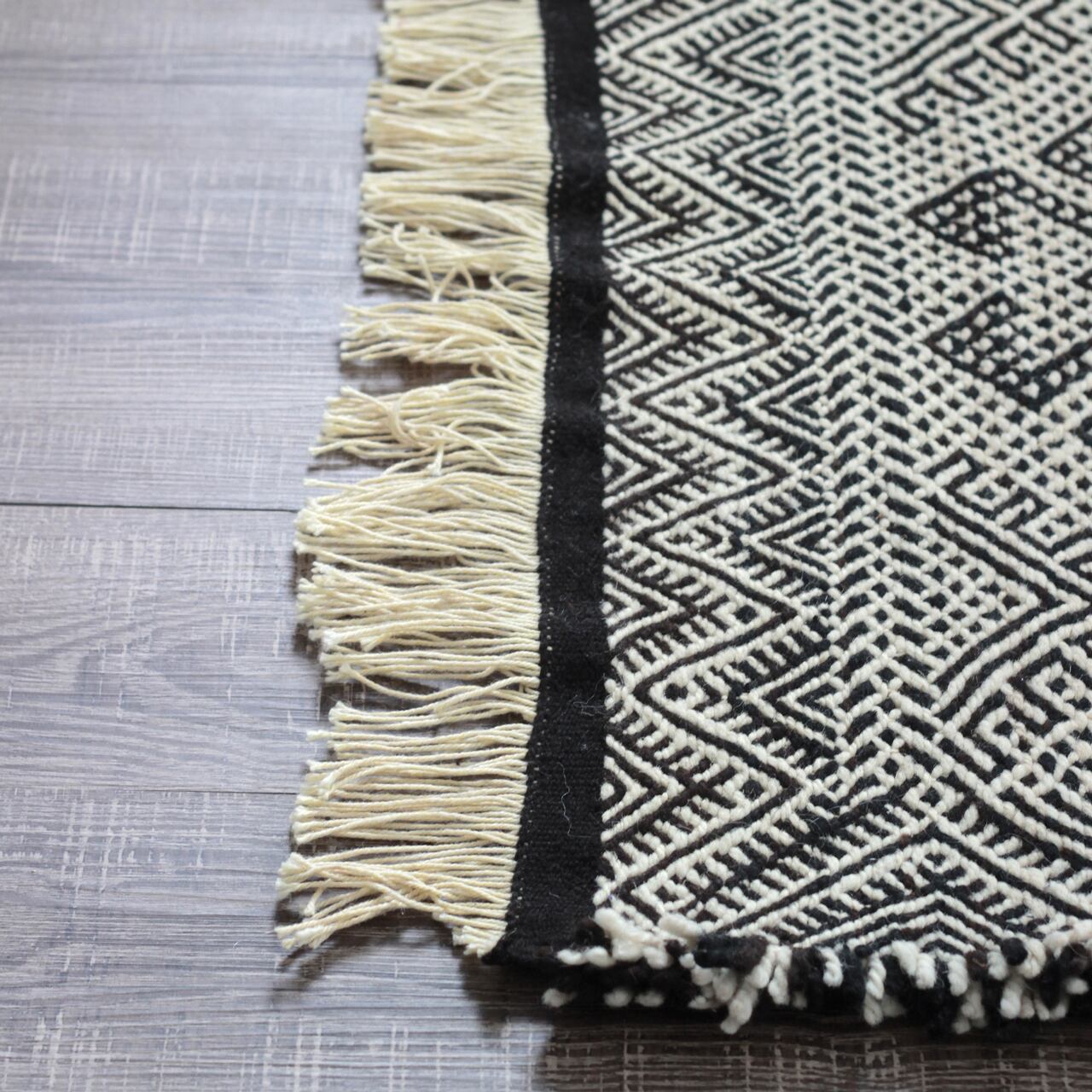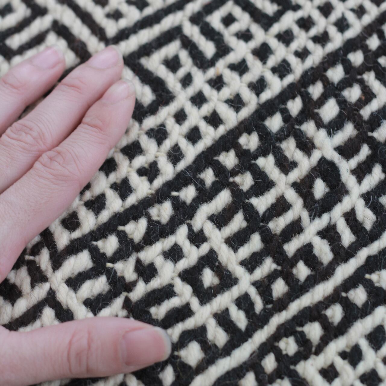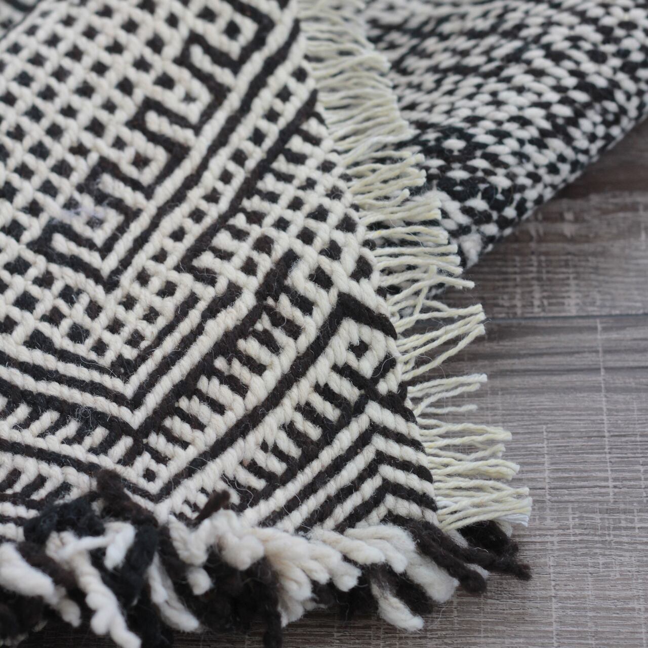 先人たちの失われた伝統を受け継いで、羊毛を手紡ぎ人の手で丁寧に織られたこだわりのスモールラグです。