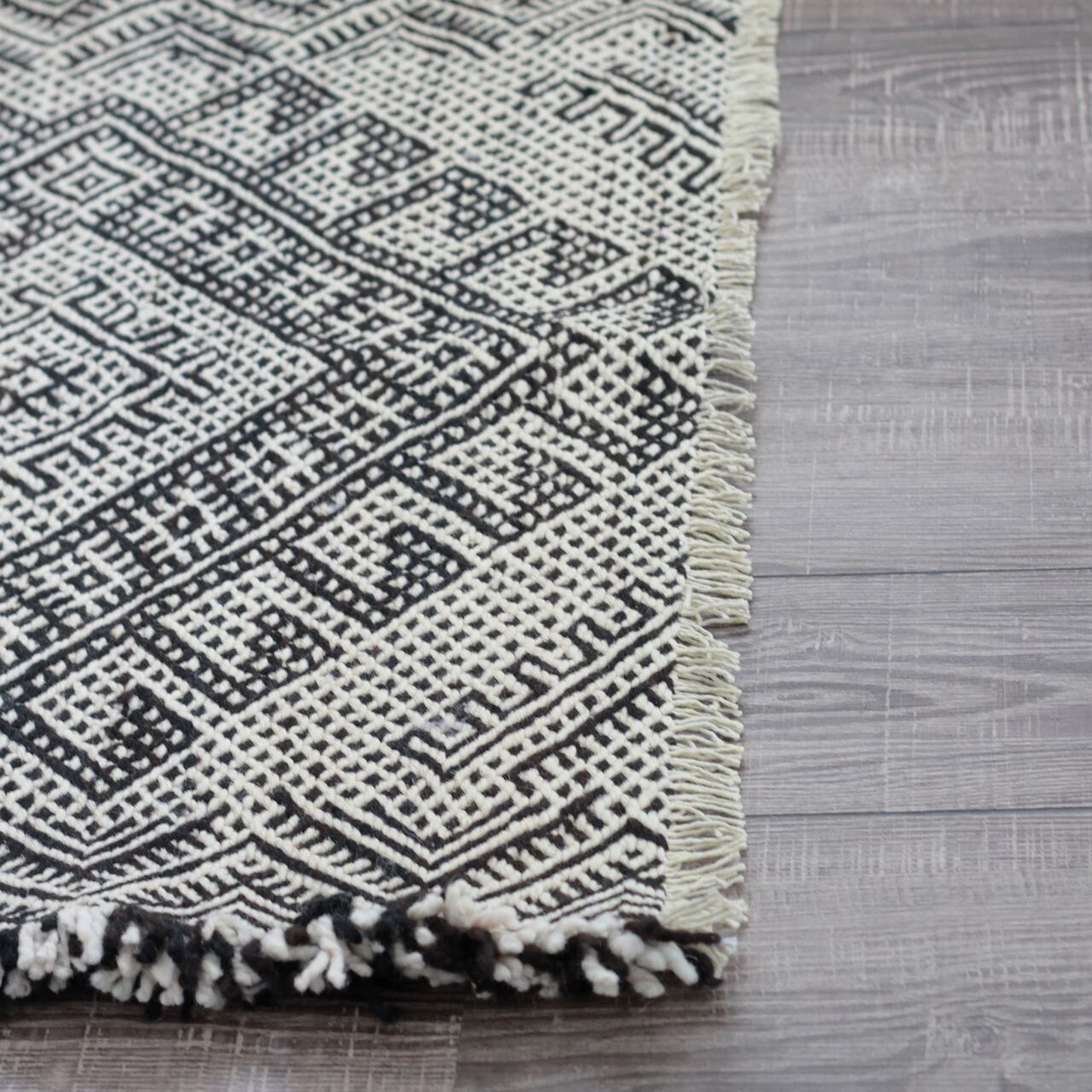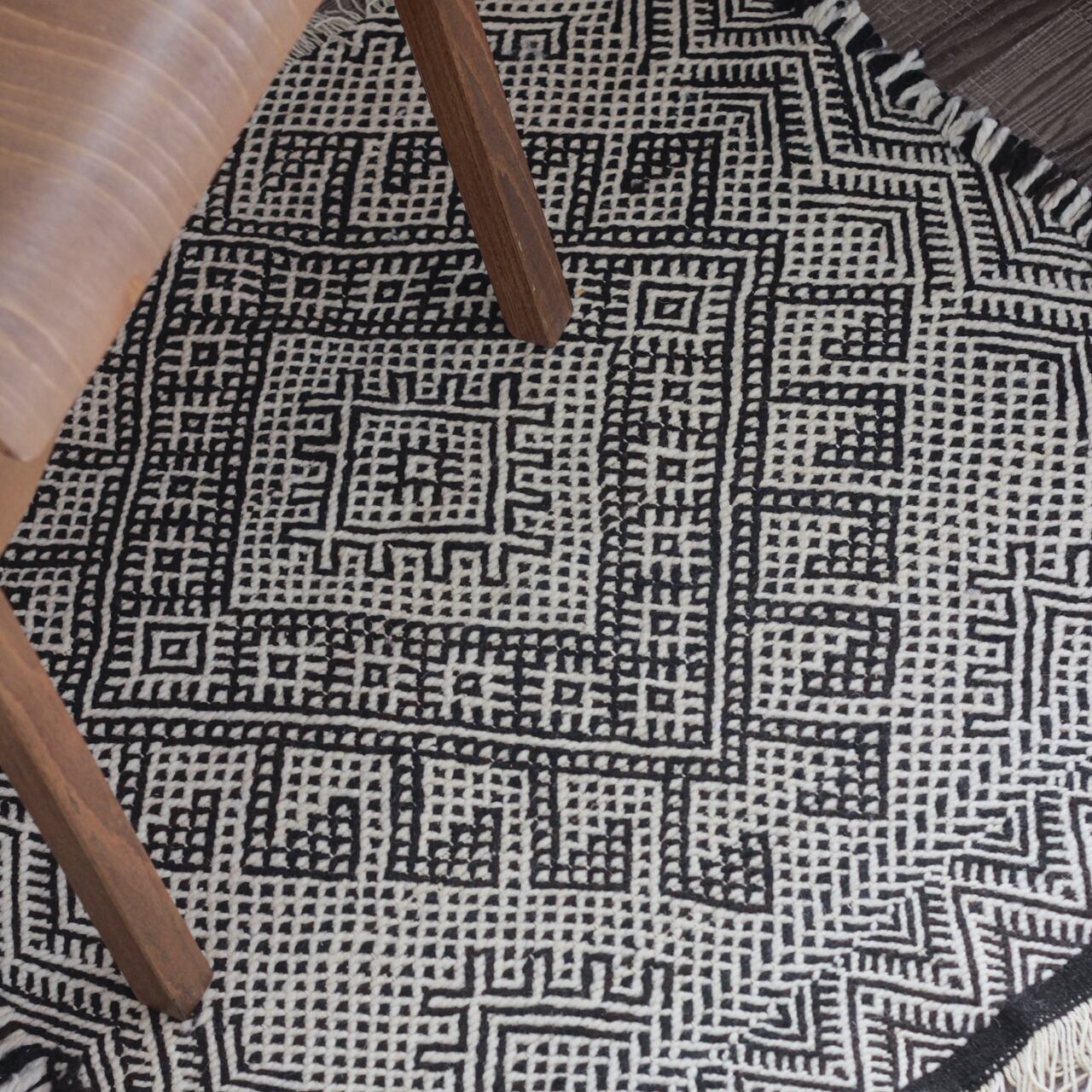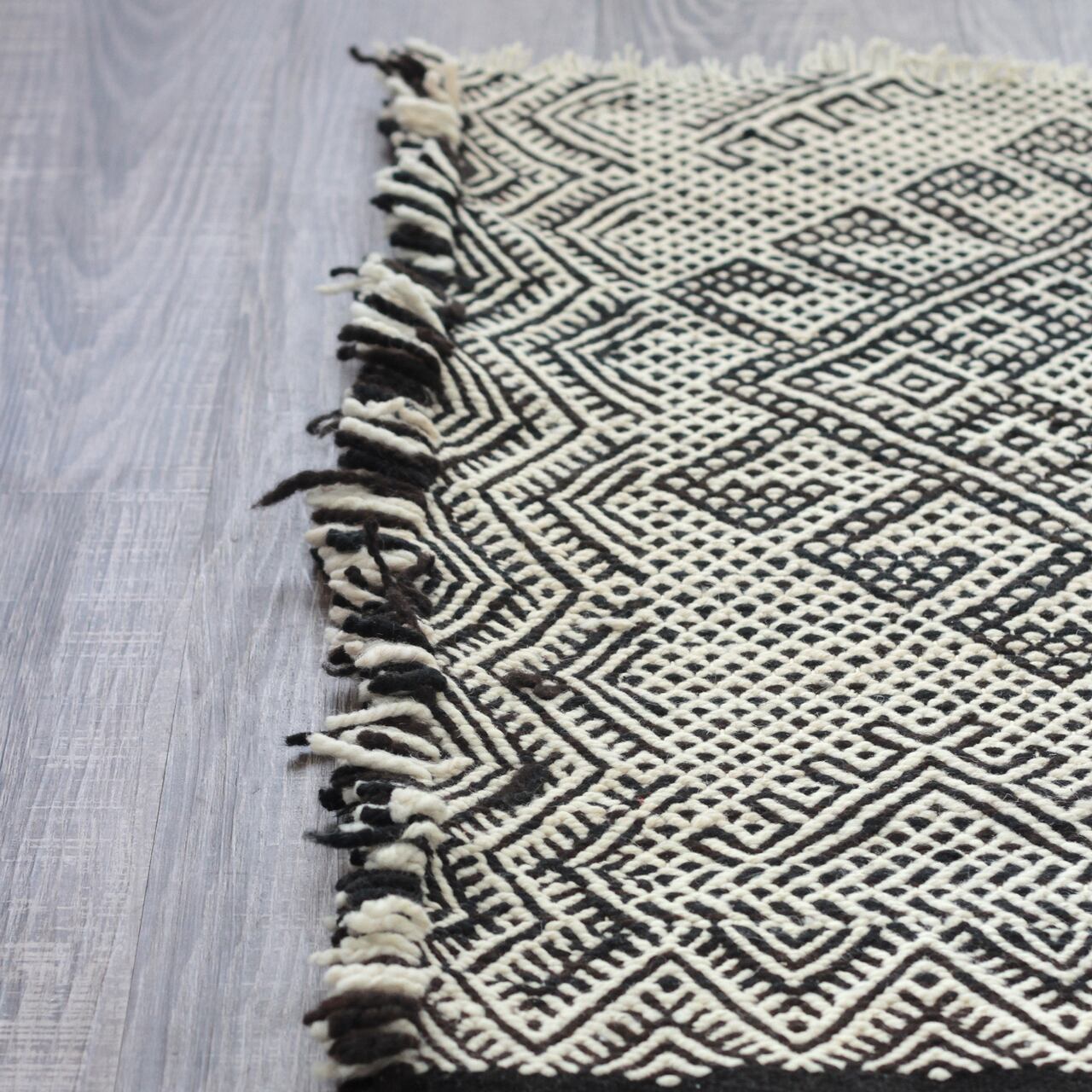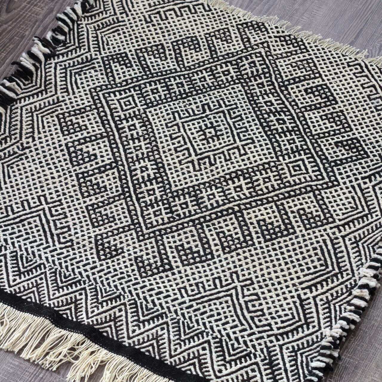 先人たちの失われた伝統を受け継いで、羊毛を手紡ぎ人の手で丁寧に織られたこだわりのスモールラグです。